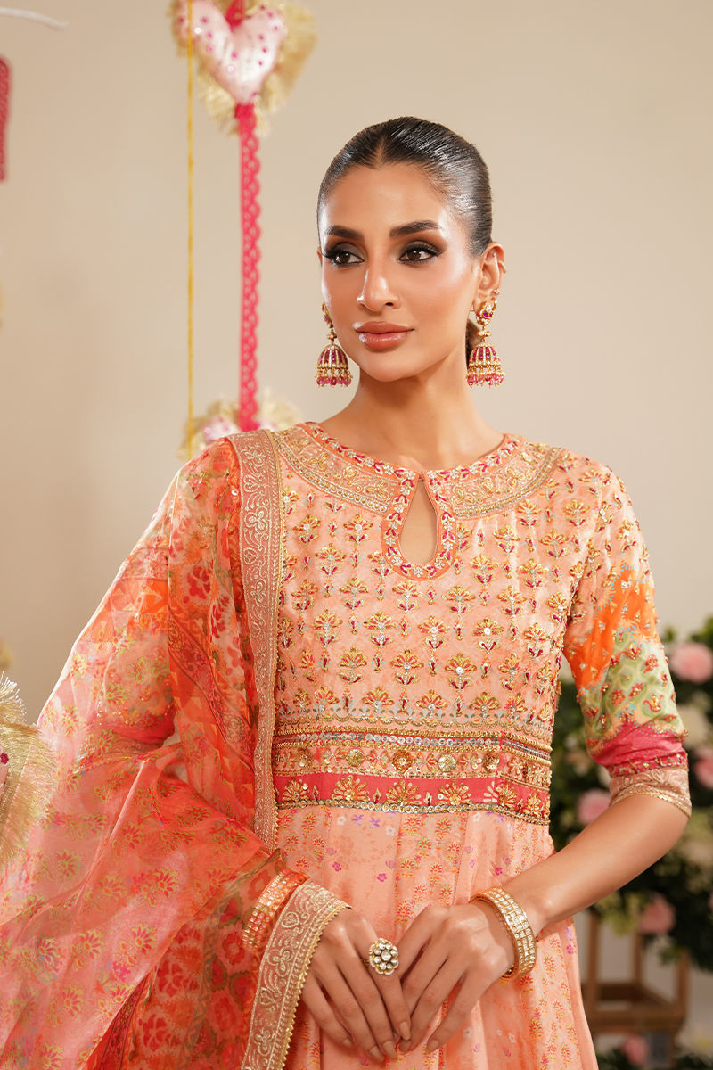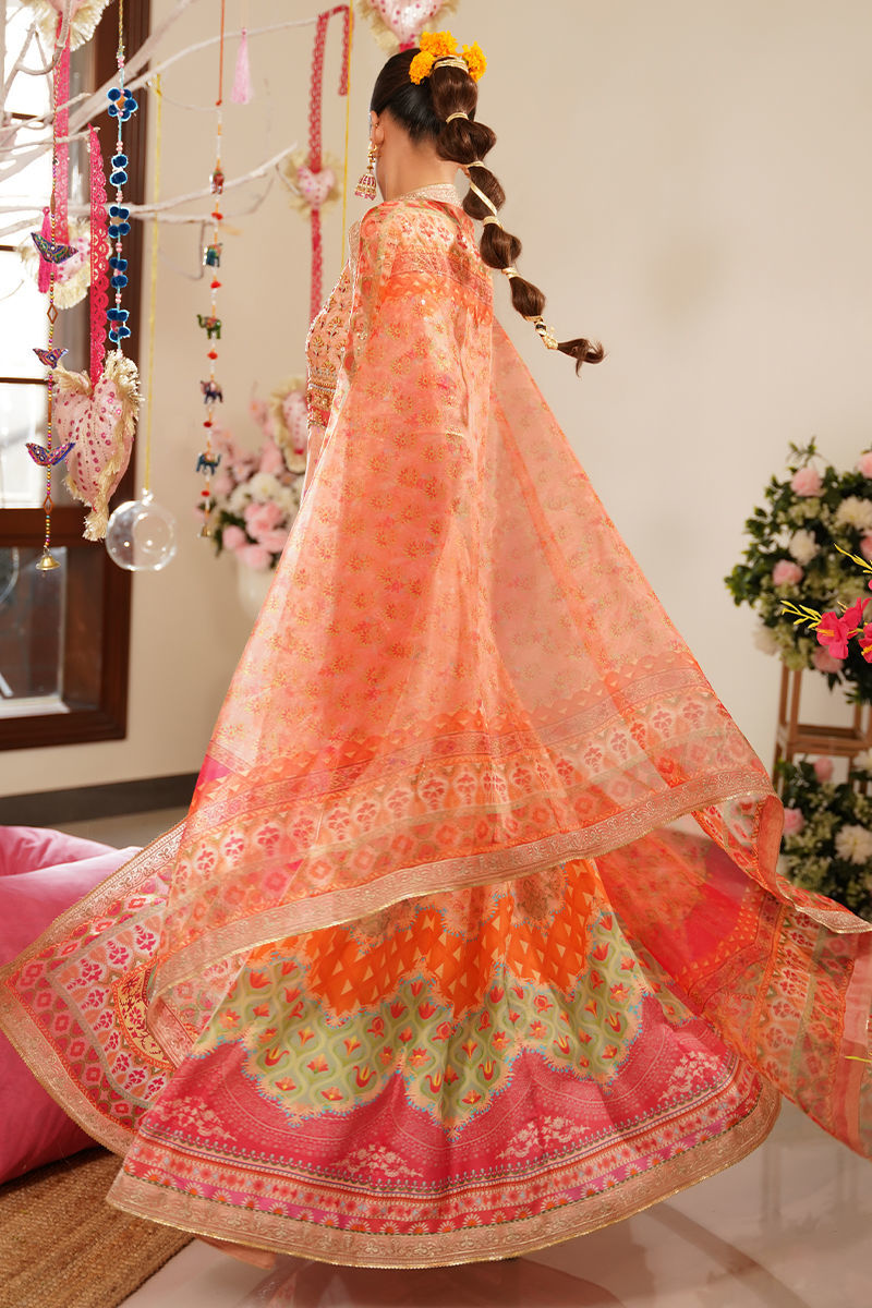 Step into a world of vibrant elegance with this beautifully crafted pink printed pishwas, designed with bold color blocking in shades of pink, orange, and green. The choli is richly adorned with intricate hand embroidery featuring gota, dabka, resham, and shimmering stones, creating a stunning interplay of texture and sparkle. A standout detail is the addition of handworked 3D butterflies delicately placed along the ghera, adding a whimsical and artistic touch to the ensemble. The look is paired with a printed organza dupatta in vibrant, festive hues, offering a light, graceful contrast to the structured pishwas. Complete your outfit with optional straight pants in pure raw silk, available as an add-on, perfect for elevating the ensemble with a refined finish. Shirt maximum length: 55 Model height 5’8 Peshwas: Pure Raw Silk Dupatta: Organza Pant: Pure Raw Silk