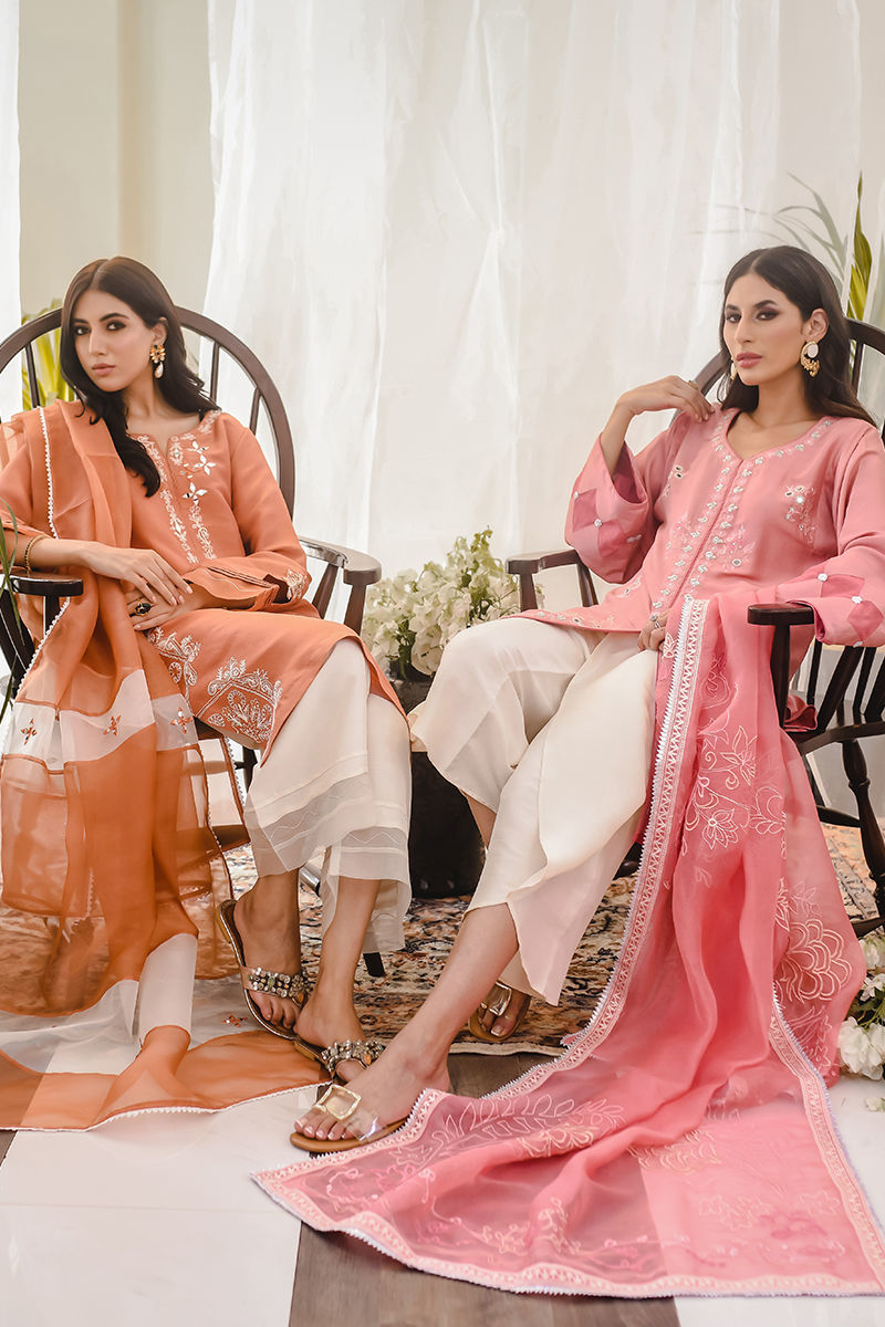 An absolute favorite this season is this front open knee-length kurta in a soothing salmon tone with intricate embroideries all over the shirt with handwork detailing. The sleeves have geometric applique details and gotta handwork. It is paired with dhoti off-white pants and a fully embroidered organza dupatta in contrasting pink.* It comes with our signature pants.Shirt: RawsilkPant: Rawsilk