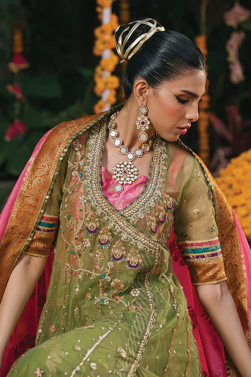 Maliya: This exquisite mushy green net angrakha is a vision of traditional elegance and contemporary charm. The angrakha features a unique wrap-around style that adds a graceful flow to its silhouette. It is adorned with intricate zardozi work, which includes detailed embroidery in gold and silver threads, creating a rich and textured appearance. Pops of colorful resham thread add vibrant highlights, enhancing the depth and beauty of the design. The angrakha is finished with colorful borders and gota detailing at the hem and sleeves, which provide a refined touch and frame the garment beautifully. Beneath the angrakha, a coral pink screen-printed tube provides a striking contrast. The angrakha is paired with a green screen-printed paneled lehenga with gota dori that echoes the mushy green of the angrakha. The dupatta contrasts beautifully with the angrakha and lehenga, crafted in a coral pink screen-printed fabric. It is adorned with appliquéd colorful scallops and detailed sitara work, which adds a layer of elegance and visual interest. Lehenga: Viscous silk Shirt: Net Dupatta: Viscous silk