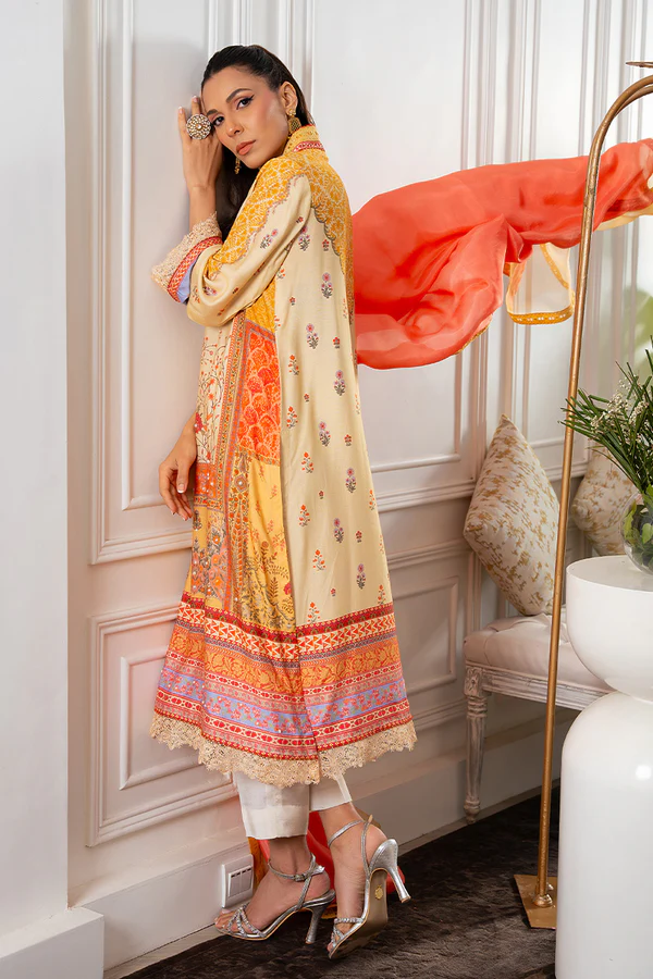 Soothing palette of lemon, coral and pinks is a dreamy in-house print on khaddi silk. Lace details and signature amna arshad handworked buttons is a statement on the neckline. Intricate pearl details on the shirt is done beautifully. Tissue silk dupatta with organza on pallus is done with four sided laces to create an understated yet classic look. Pants are on pure raw silk.