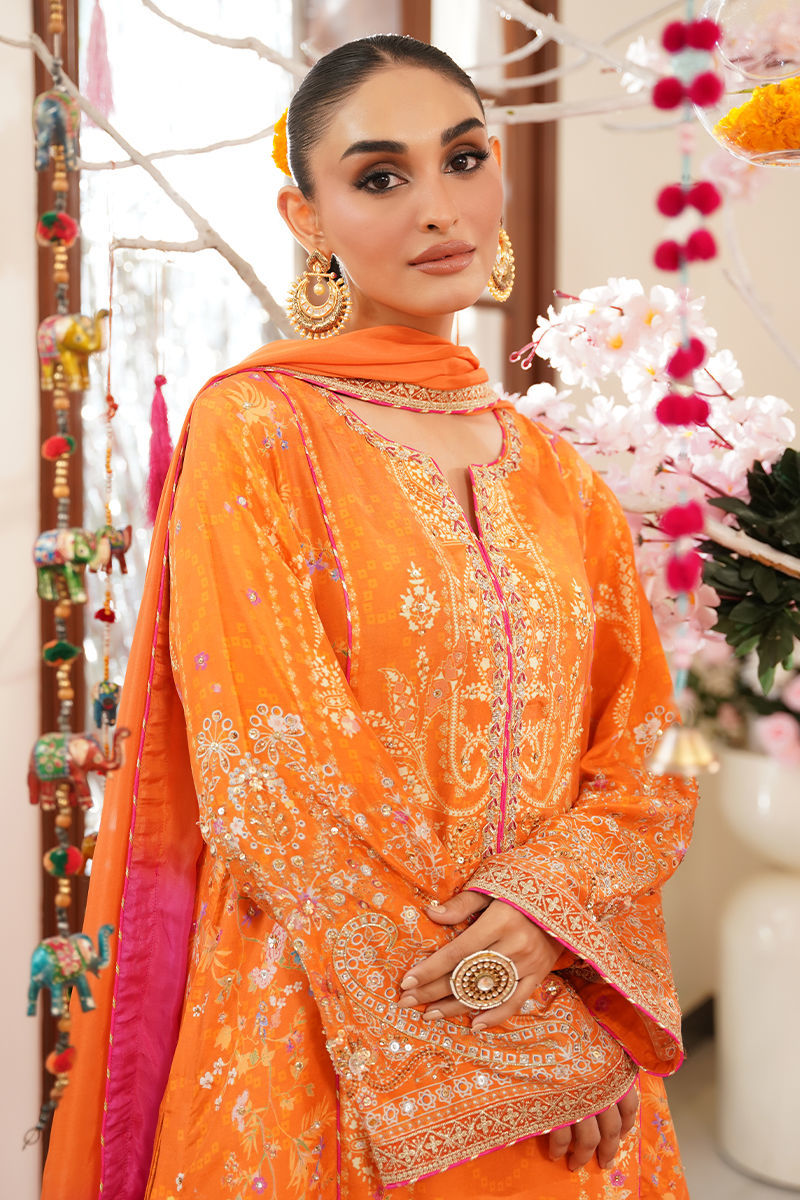 Embrace timeless elegance with this stunning mustard-orange kurta, beautifully adorned with delicate floral motifs in soft pinks and beige. The design is elevated with intricate hand embellishments of gota, dabka, and Swarovski crystals, adding just the right touch of shimmer and sophistication. A neat piping finish adds structure and finesse to the overall silhouette. Paired with a graceful two-tone dyed dupatta, featuring subtle color transitions and finished with elegant zari borders, this ensemble exudes understated luxury. A crushed dhaka is offered as an optional add-on, perfect for those who want to complete the look with a rich, textured bottom. Ideal for festive gatherings, intimate weddings, or celebratory events, this ensemble blends tradition and modern elegance effortlessly. Shirt maximum length: 54 Model height 5’5 Dhaka: Cotton Silk Shirt: Pure Raw Silk Dupatta: Tissue Silk