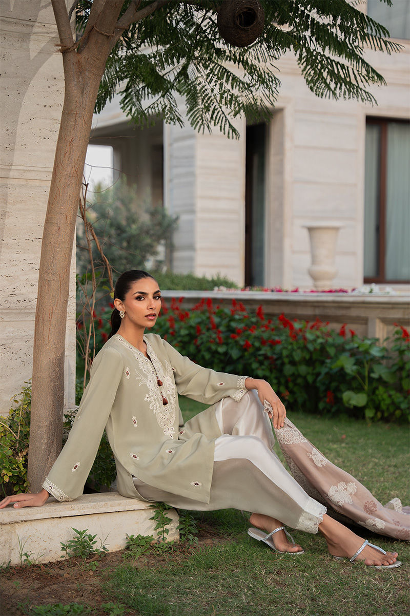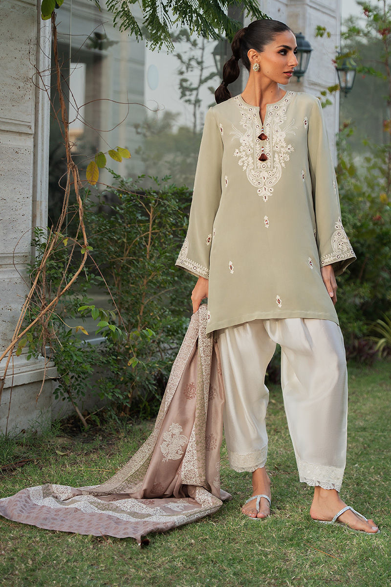 A fresh pistachio short pure crepe shirt adorned with delicate aari embroidery, mirror accents, and playful tassel detailing on the neckline. Paired with a brown cotton net dupatta featuring block prints in shades of ivory, green, and self, and complemented with an ivory shalwar as an elegant add-on. model is wearing 34" Length