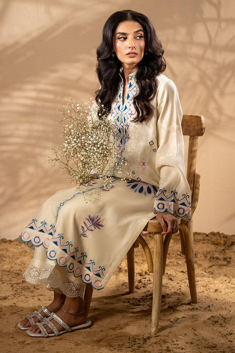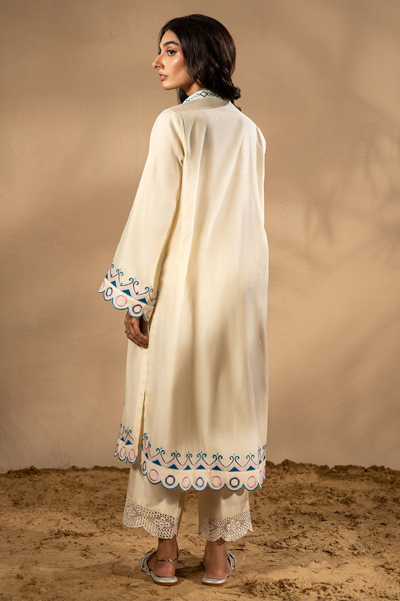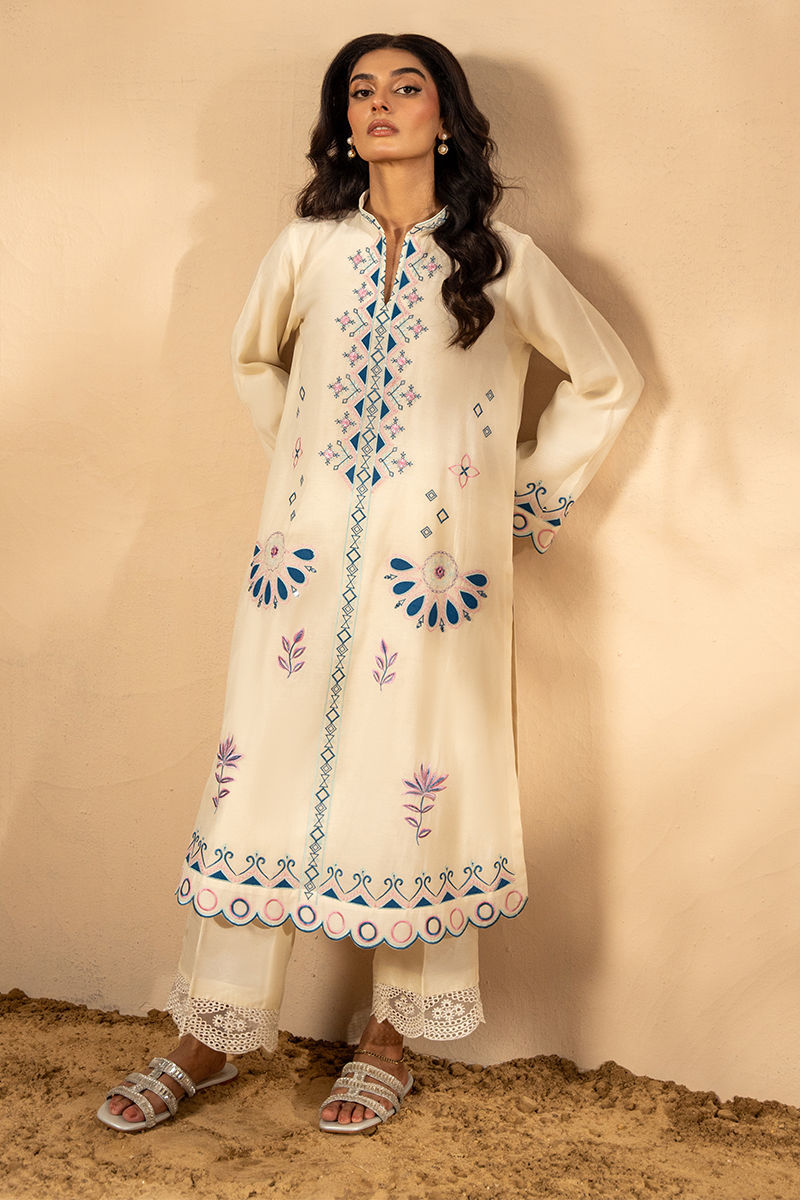 This white kora cotton shirt is a breath of fresh air in refined minimalism. Crafted from airy, lightweight fabric, it features delicate embroidery and subtle applique work in soft tones of blues and pinks, creating a serene yet sophisticated palette. the outfit is complete with pure raw silk pant with embroidered borders on the hem. The minimal detailing makes it an ideal choice for daytime gatherings, casual summer festivities, or elegant everyday wear. Pants are add onShirt maximum length 45Model height: 5'5