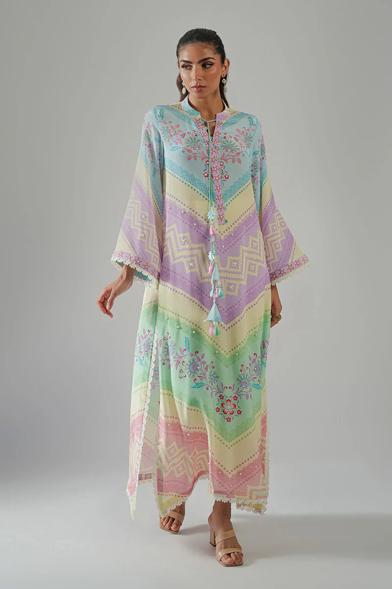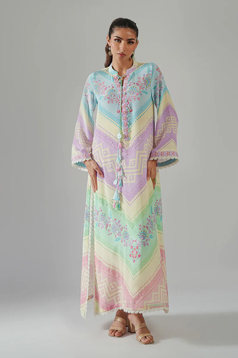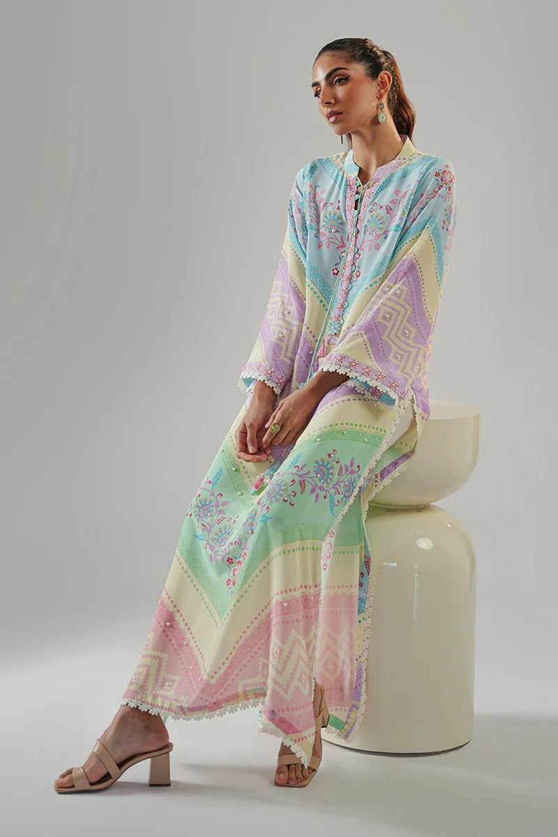This beautiful outfit features a printed crepe long-cut kurta, showcasing a soft, flowing silhouette that enhances both comfort and style. The kurta is adorned with pastel diagonal arrow patterns, arranged in a way that adds a modern, geometric flair to the traditional design. The subtle pastel hues blush pink, lavender, and mint green blend seamlessly, creating a fresh, airy vibe that's perfect for spring or summer. rawsilk pants are an add on. Model height 5'10. Maximum shirt length 56" Shirt: Pure Crepe Pant: Pure Rawsilk