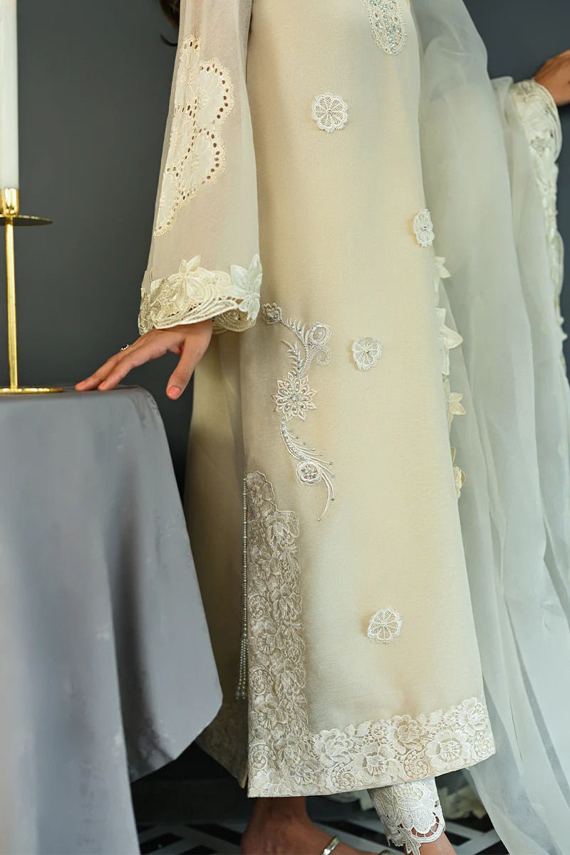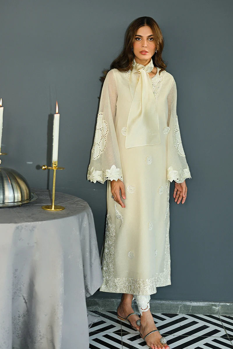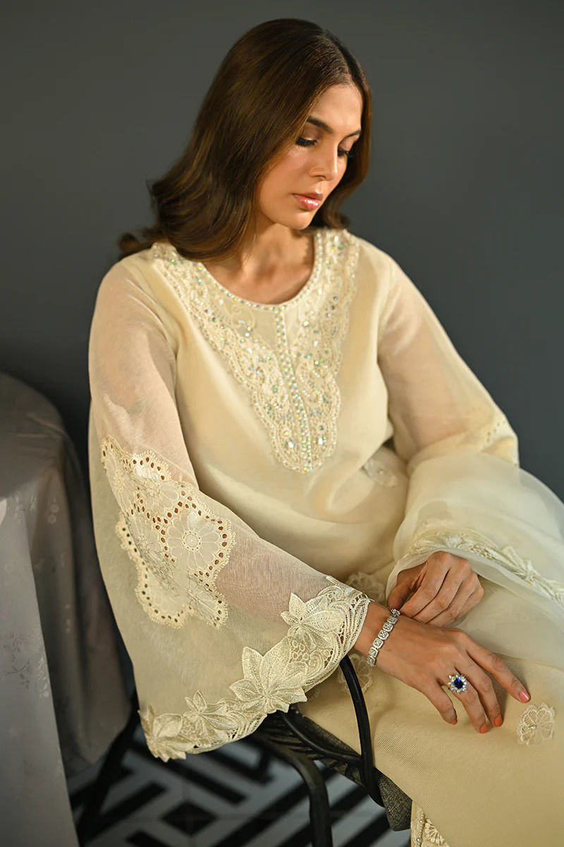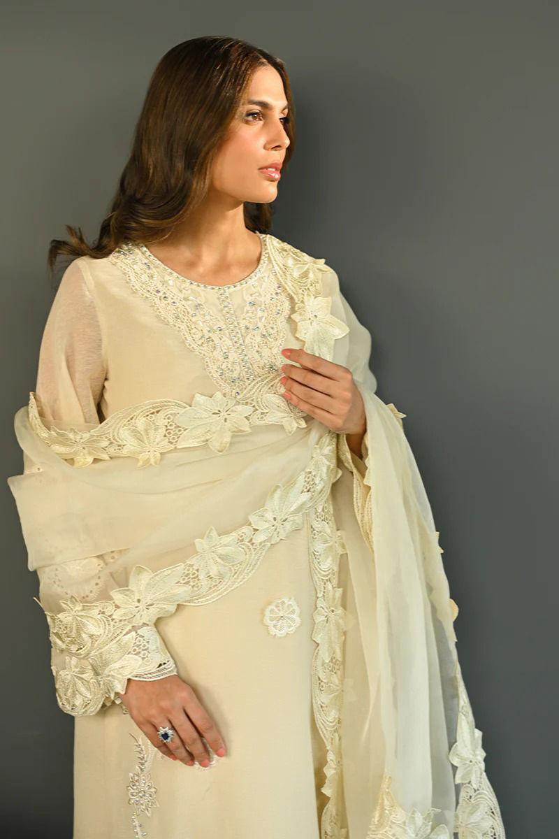 This exquisite ivory outfit is crafted from our signature in-house cotton organza, offering a delicate and ethereal look. The neckline is adorned with intricate hand embroidery, showcasing meticulous craftsmanship that adds a touch of elegance. The hemline is similarly detailed with fine, intricate embroidery, ensuring a graceful finish. The bell sleeves are a highlight, featuring delicate cutwork floral lace and embroidery, offering a soft, feminine charm. Paired with this ensemble is an organza dupatta, elegantly finished with cutwork lace that complements the outfit’s refined aesthetic. The pants complete the look, featuring a carefully embroidered motif, adding a subtle yet sophisticated detail to the overall design. This outfit exudes timeless grace, perfect for a luxurious, high-fashion look. Pant is an add on.Shirt maximum length 52Model height 5’11