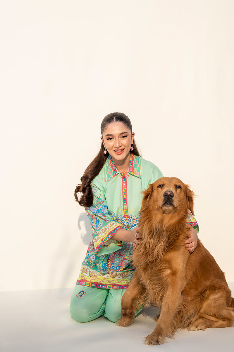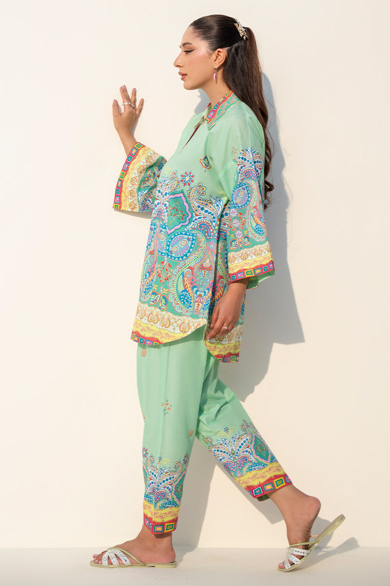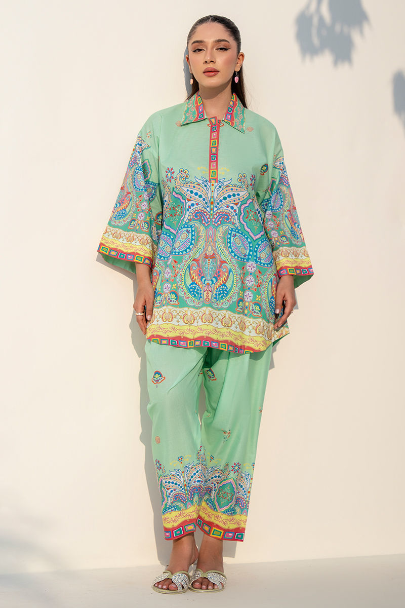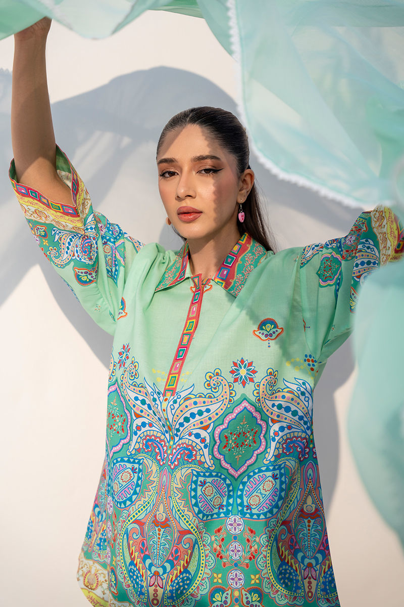 Fresh, lively, and effortlessly stylish, this mint green cambric lawn set features a beautifully printed short shirt paired with a classic shalwar. The refreshing mint base is enhanced with vibrant pops of yellow, blue, and green, creating a playful yet elegant visual harmony. Designed with a smart collar detail, the shirt adds a touch of structured charm while keeping the look light and breathable. Perfect for everyday ease with a polished finish, this ensemble blends comfort with cheerful sophistication. SHIRT LENGTH: 32"