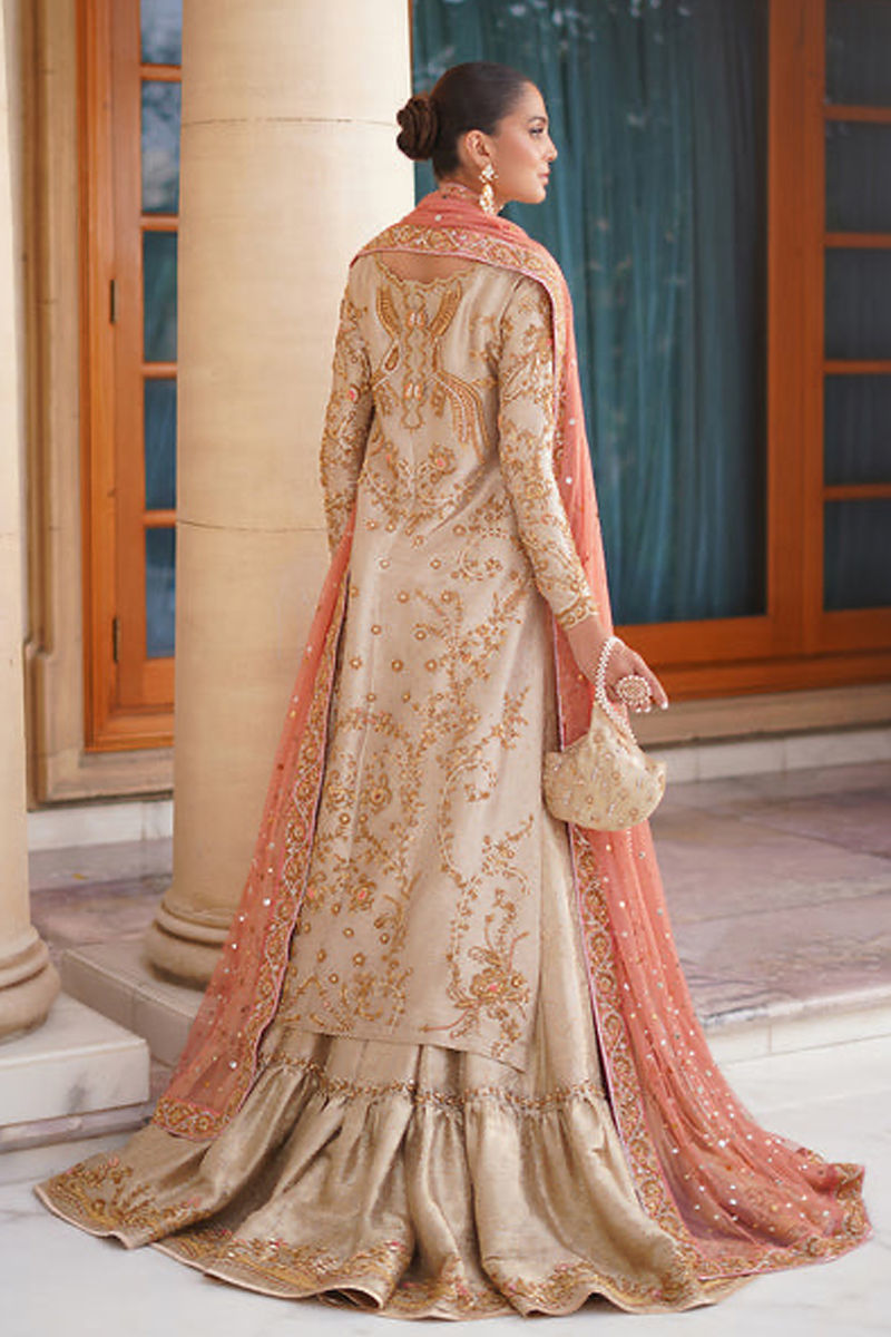 A statement of timeless elegance, this gold bridal ensemble is exquisitely crafted with a pure lama silk shirt and a regal pure atlas jamawar lehenga, paired with a contrasting coral net dupatta that adds a striking pop of color. The design is adorned with intricate antique gold dabka, Swarovski stones, sitara, and delicate resham accents, creating a luminous harmony of textures. The modern layout of embellishment is thoughtfully balanced with traditional craftsmanship, making it both contemporary and classic. Completing the look, a hand-embellished pouch adds the perfect finishing touch, enhancing its bridal grandeur.