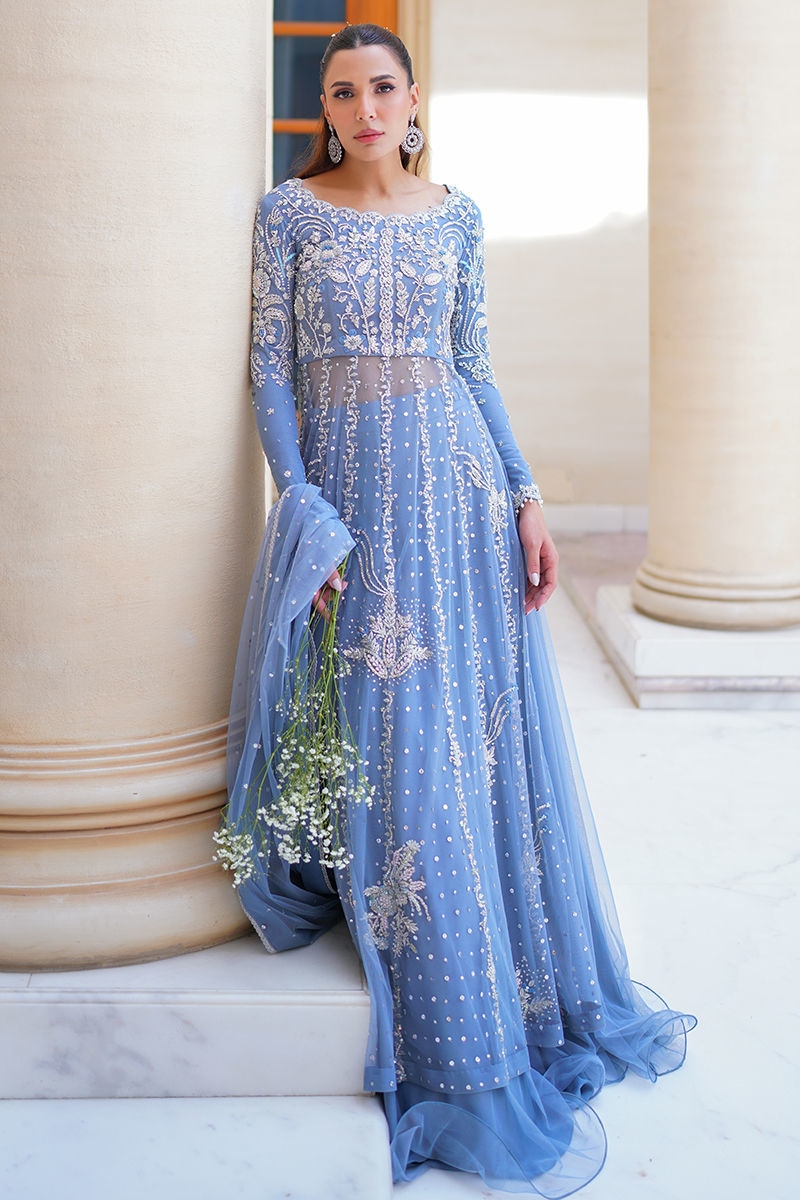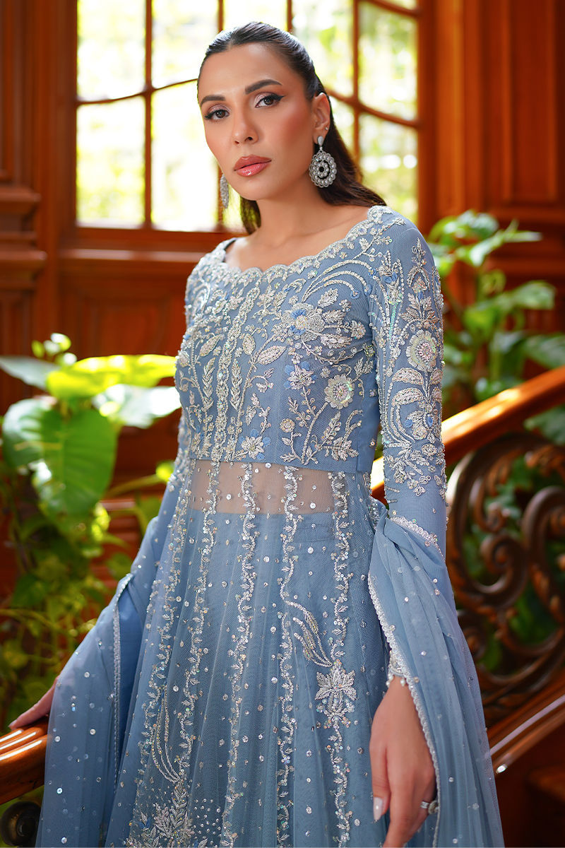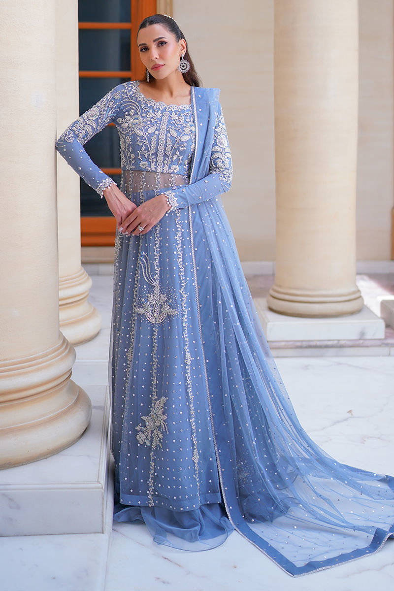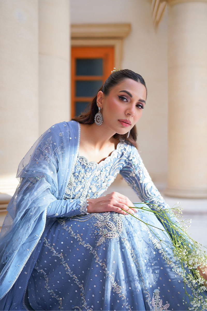 A statement of contemporary elegance, this blue net peshwas is paired with a voluminous lehenga and dupatta, designed to exude modern charm. The peshwas is exquisitely embellished with contemporary motifs and silver handwork of resham, Swarovski crystals, dabka, and kora, creating a luminous yet refined sparkle. The net dupatta, detailed with delicate chan all over, adds a soft, graceful allure. The lehenga is finished with a fish-wiring technique, enhancing its structure and adding dramatic volume for that perfect bridal oomph. Lehenga: Net Shirt: Net Dupatta: Net