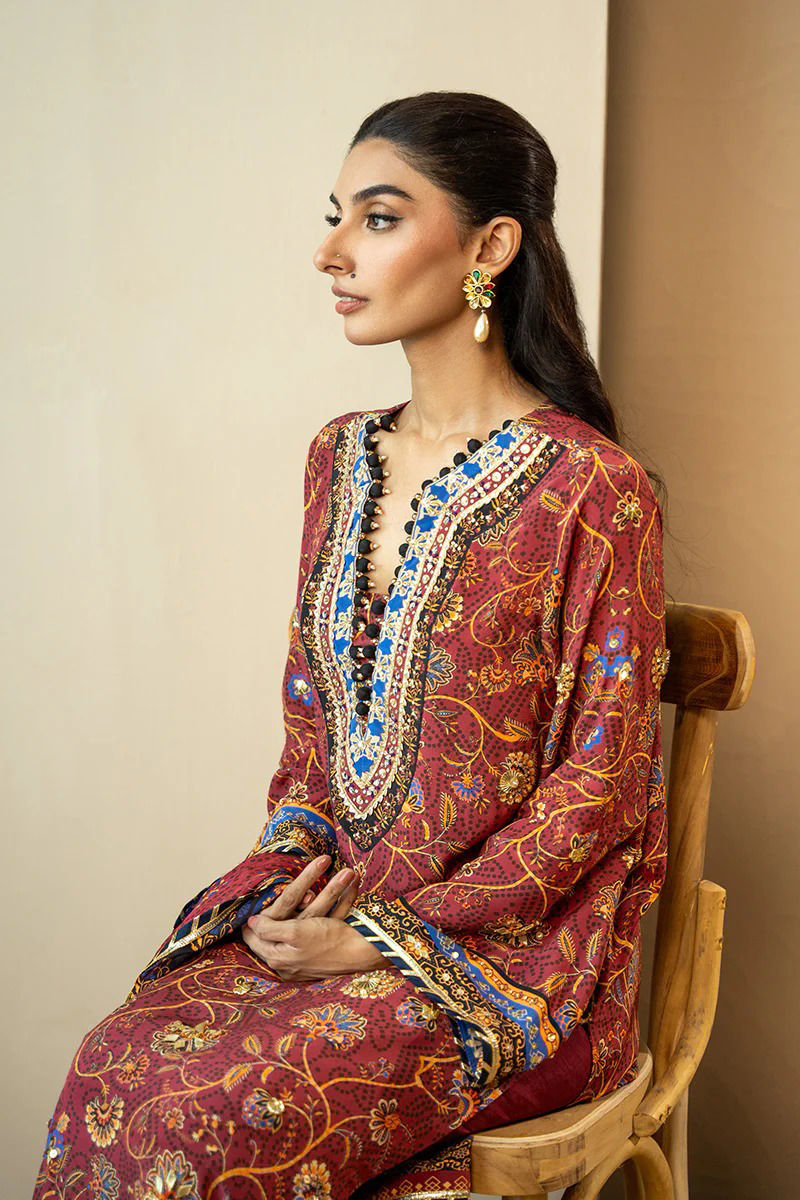 Rich, radiant, and rooted in tradition — this maroon printed pure crepe ensemble is a striking ode to timeless elegance. The fluid crepe fabric drapes beautifully, while intricate gotta and dabka handwork adds a touch of festive shimmer, highlighting the artisanal craftsmanship. The ensemble is paired with a printed dupatta that carries a harmonious blend of motifs and colors, offering a refined contrast that enhances the overall look. Perfect for celebratory occasions, this outfit blends heritage detailing with effortless grace. Pants are add on.Shirt maximum length 48Model height: 5’5