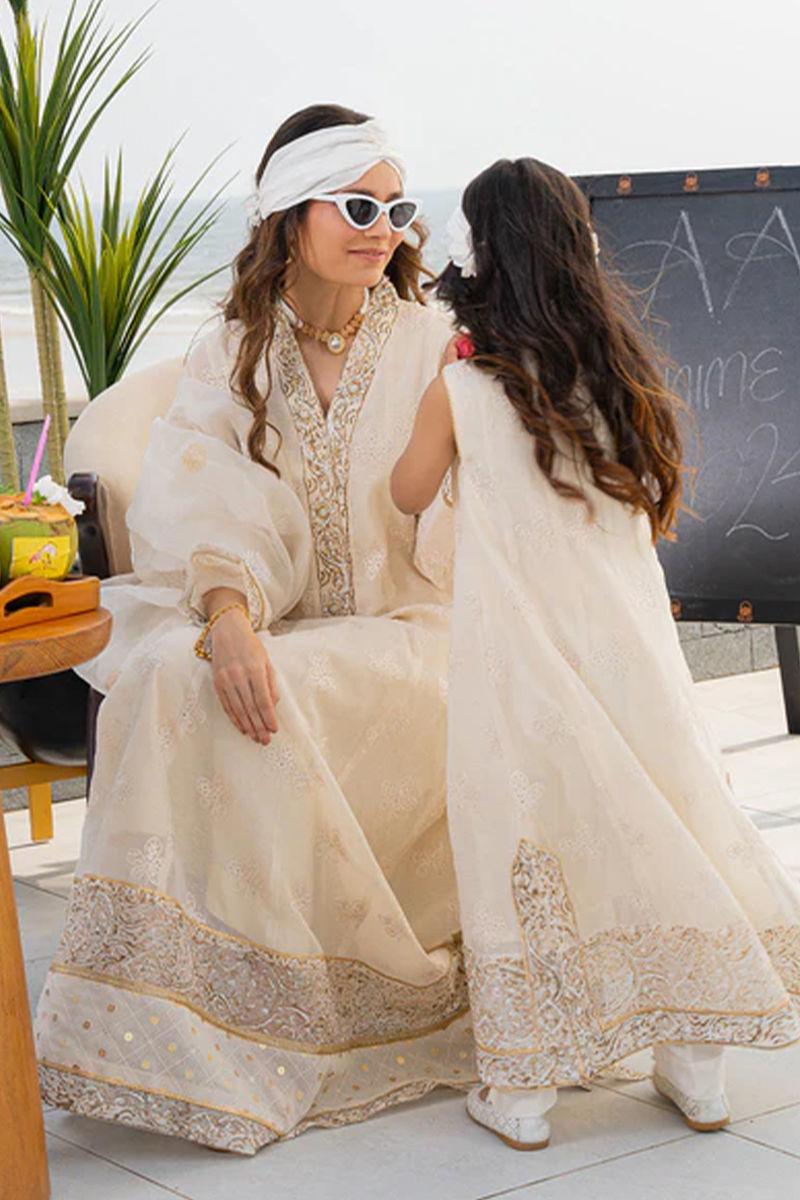 adorable block kalidar cut shirt on cotton organza shirt with minimal hand work, enhanced with gota laces. Style it up with cute bows , bandanas and shades making it a perfect eid outfit pants are on silkShirt: Cotton OrganzaPant: Cotton Organza