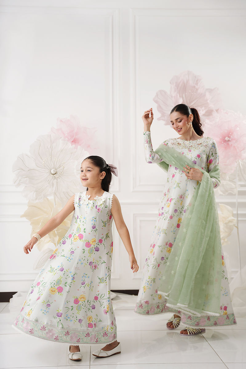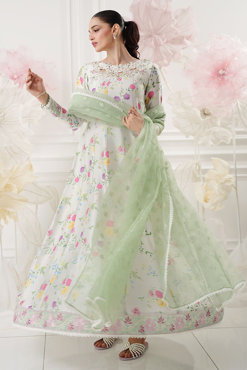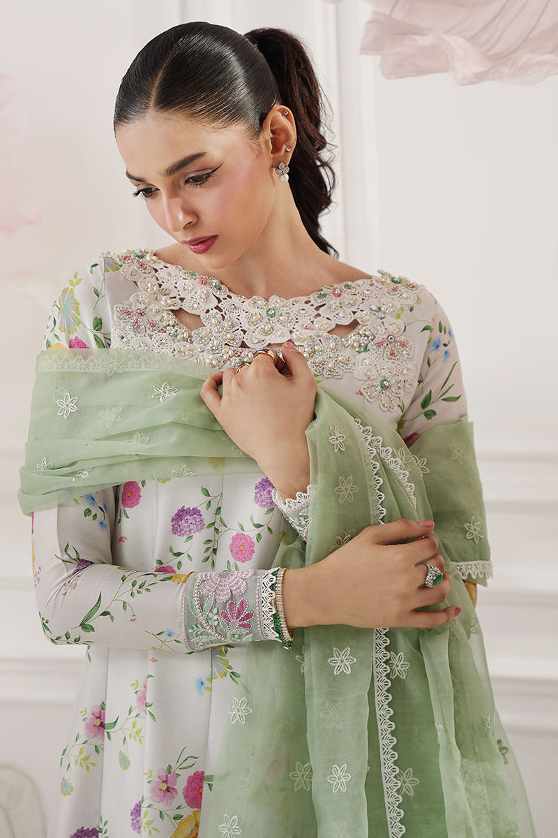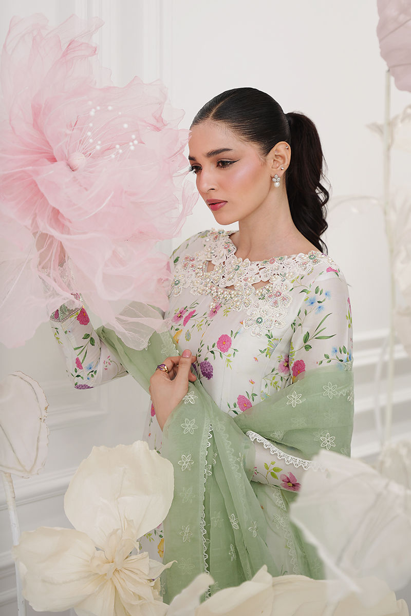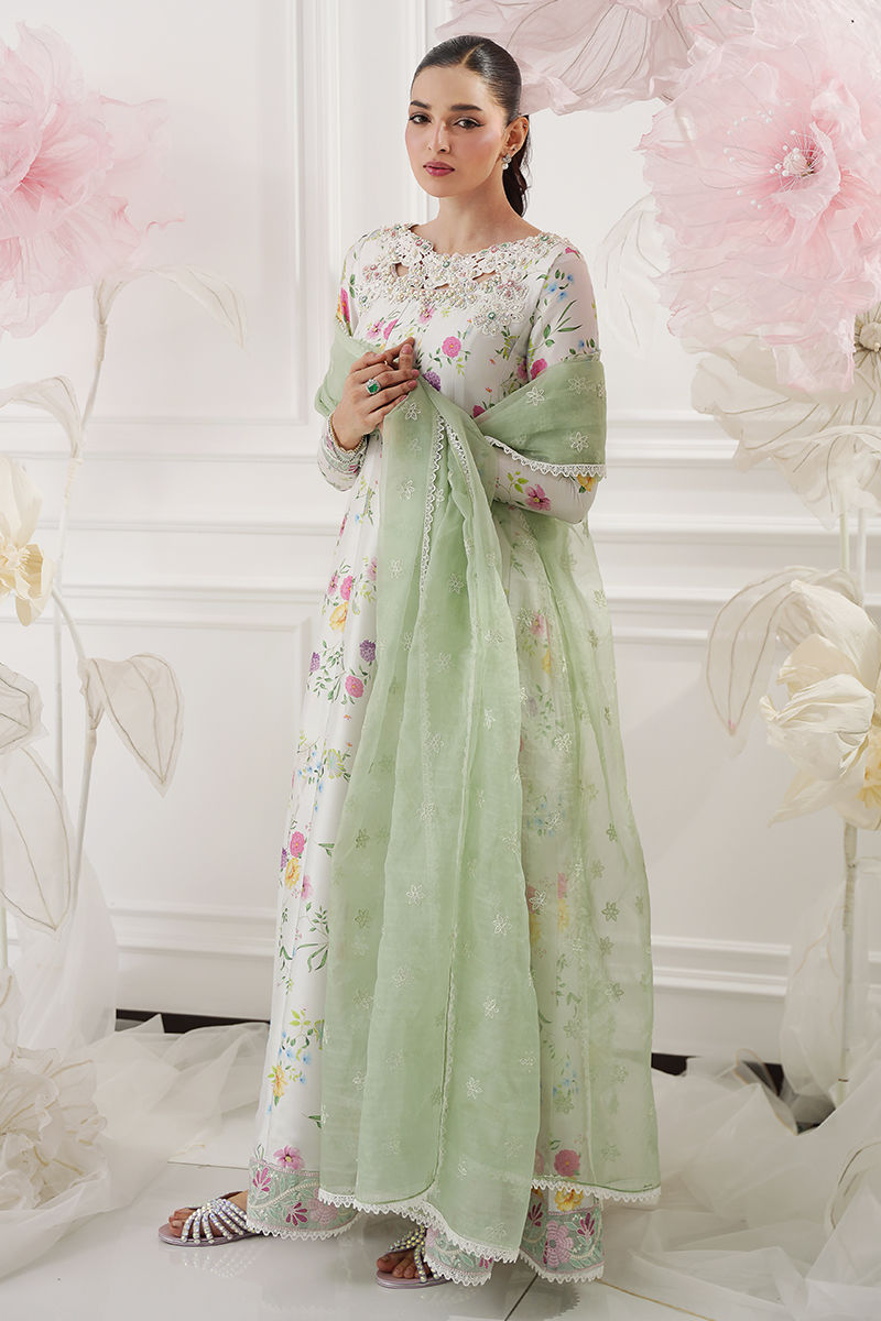 A graceful ivory kalidar crafted from buttersilk, adorned with a soft floral print that exudes timeless elegance. The beautifully detailed cutwork floral neckline is delicately embellished with Swarovski crystals, adding a refined sparkle, while resham-embroidered borders along the hem enhance the silhouette with artisanal charm. Paired with an embroidered green organza dupatta that brings a fresh contrast and completes the look. Straight pants are available as an add-on for a perfectly coordinated ensemble. Model height 5'8 , Shirt length : 57'