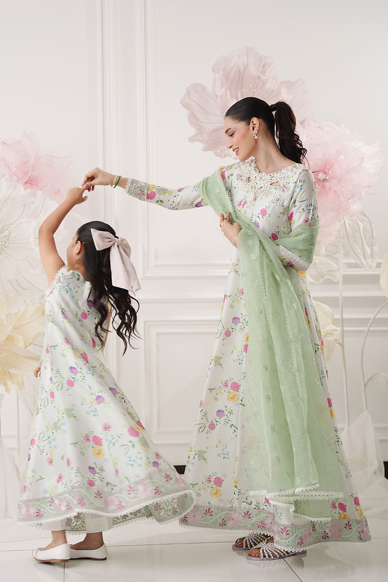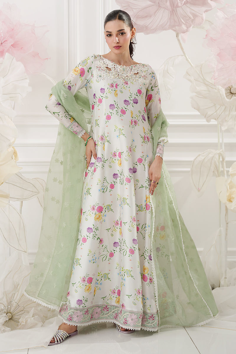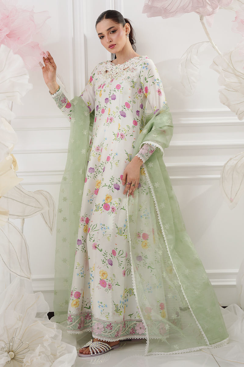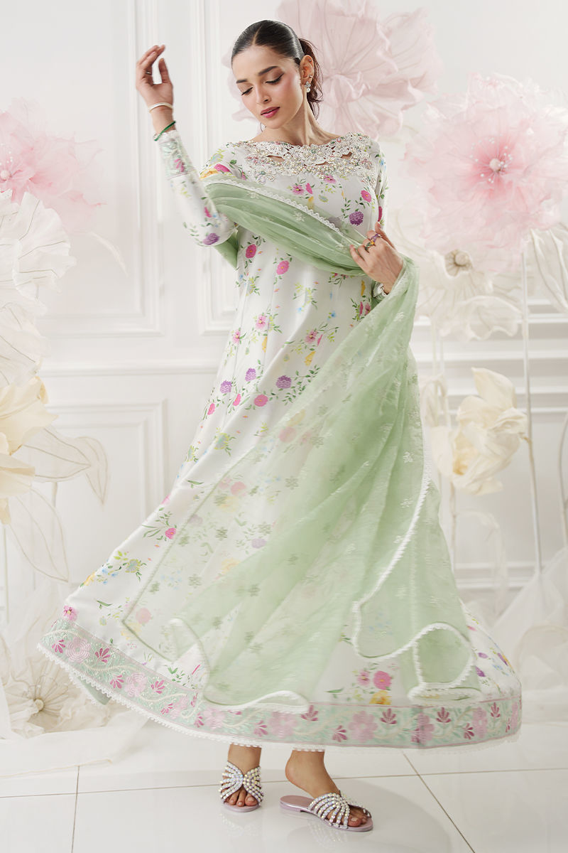 A graceful ivory kalidar crafted from buttersilk, adorned with a soft floral print that exudes timeless elegance. The beautifully detailed cutwork floral neckline is delicately embellished with Swarovski crystals, adding a refined sparkle, while resham-embroidered borders along the hem enhance the silhouette with artisanal charm. Paired with an embroidered green organza dupatta that brings a fresh contrast and completes the look. Straight pants are available as an add-on for a perfectly coordinated ensemble. Model height 5'8 , Shirt length : 57'