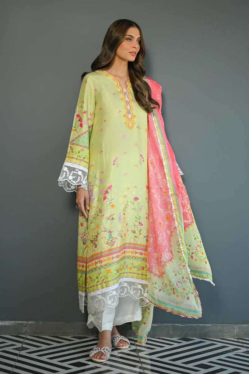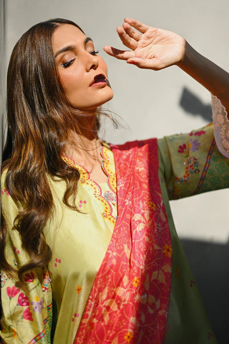 This mint green floral printed pure rawsilk shirt is a vibrant blend of delicate blooms in shades of yellow, pink, and ivory, creating a soft yet lively look. The shirt is meticulously finished with an embroidered border, adding a touch of intricate craftsmanship,while hand embroidery accents on the design offer a personalized, artisanal finish. Paired with a luxurious printed silk dupatta, the ensemble exudes elegance, with the rich silk fabric enhancing the colors and floral motifs for a truly refined and graceful appearance. Pants are an add on. Shirt maximum length 52 Model height 5'11