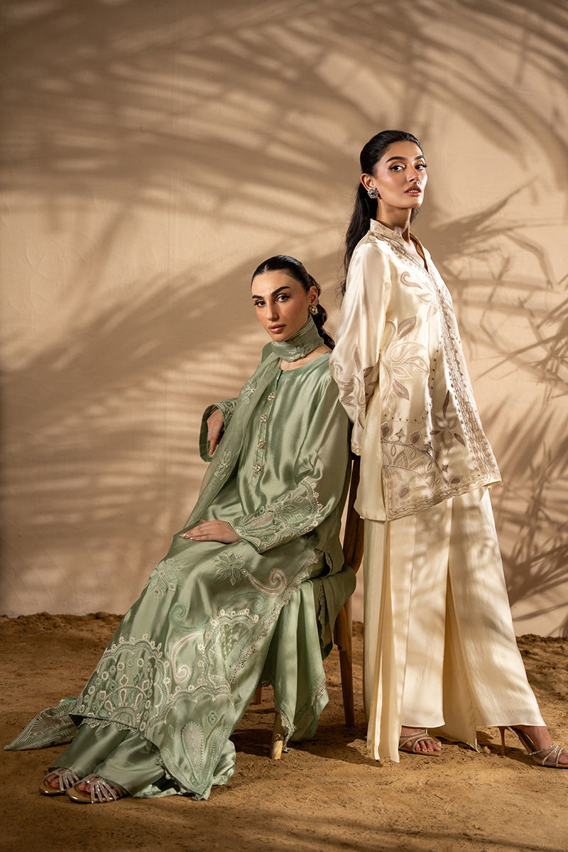 This ensemble features a stunning pistachio sheesha silk long shirt, exuding a luxurious aura. The shirt is adorned with intricate, white and self on self embroidery and applique motifs, creating a rich, textured look that highlights traditional craftsmanship. The side slits are detailed with lace work. Paired with the shirt is an exquisite inhouse embroidered organza dupatta, showcasing tassels at the edges that elevates the overall look with its graceful, airy feel. Completing the outfit is a pant made from matching sheesha silk, offering a sleek, contemporary silhouette that balances the opulence of the top and dupatta. Dupatta is an add on.Shirt maximum length 50Model height 5"9