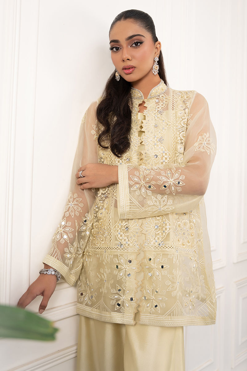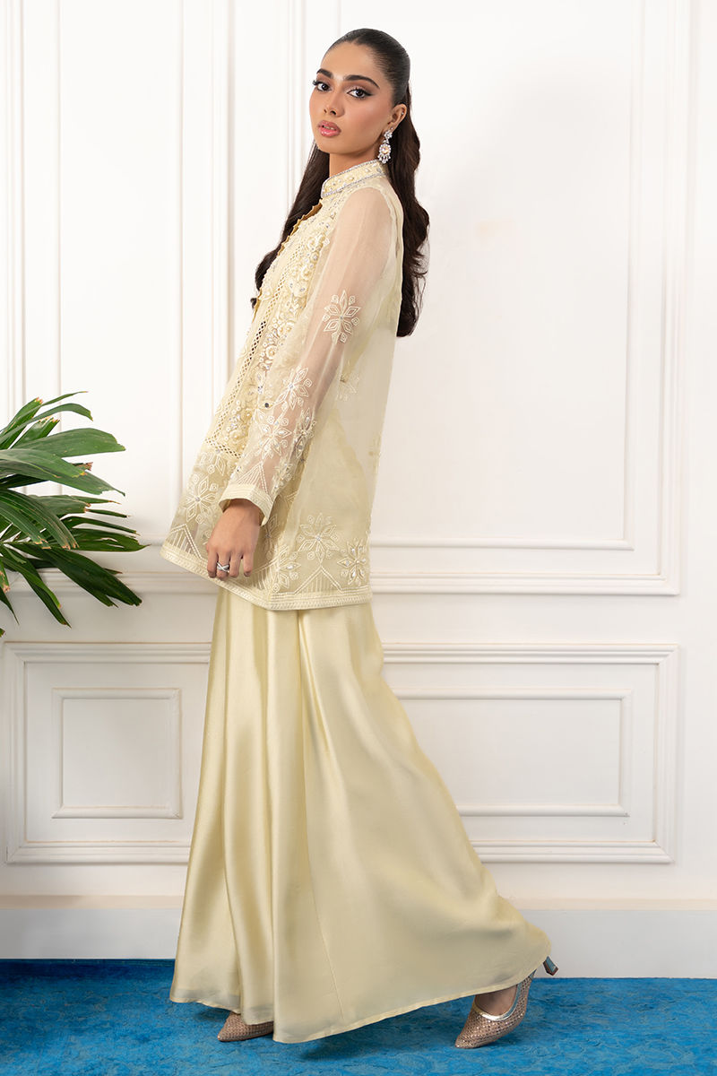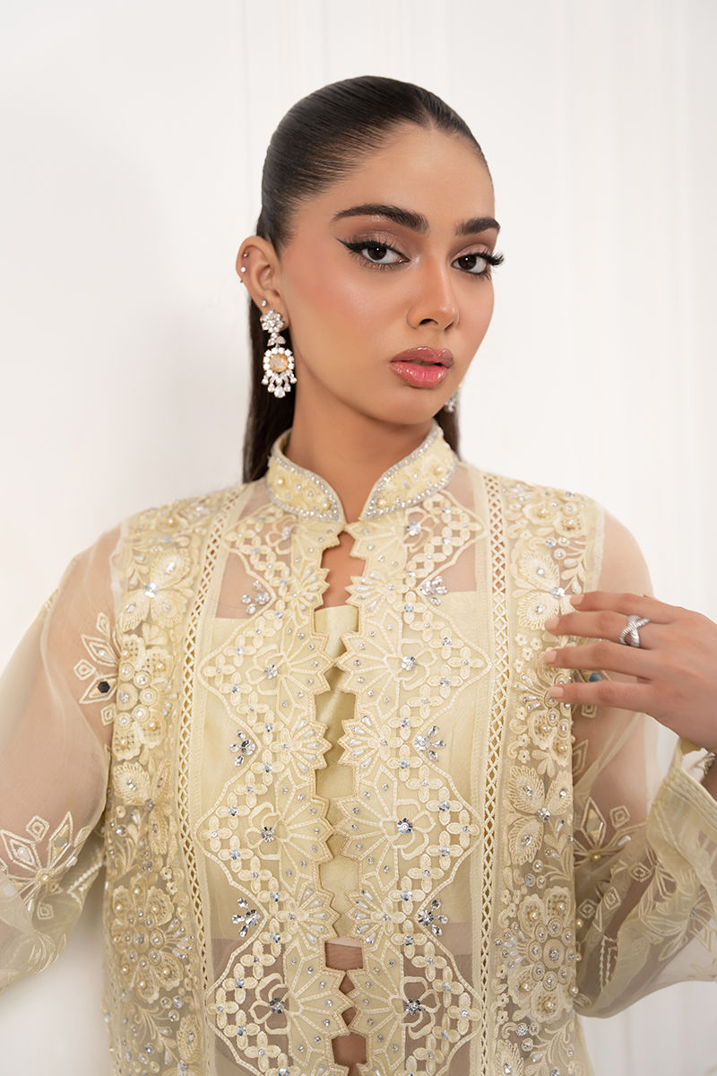 A radiant yellow organza jacket in a front-open, cutwork design, intricately detailed with exquisite hand embroidery featuring pearls, Swarovski crystals, and delicate stones. The sheer elegance is layered over a sleek slip, while a traditional dhaka completes the look, adding graceful volume and timeless charm.