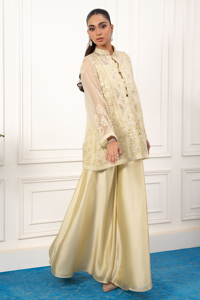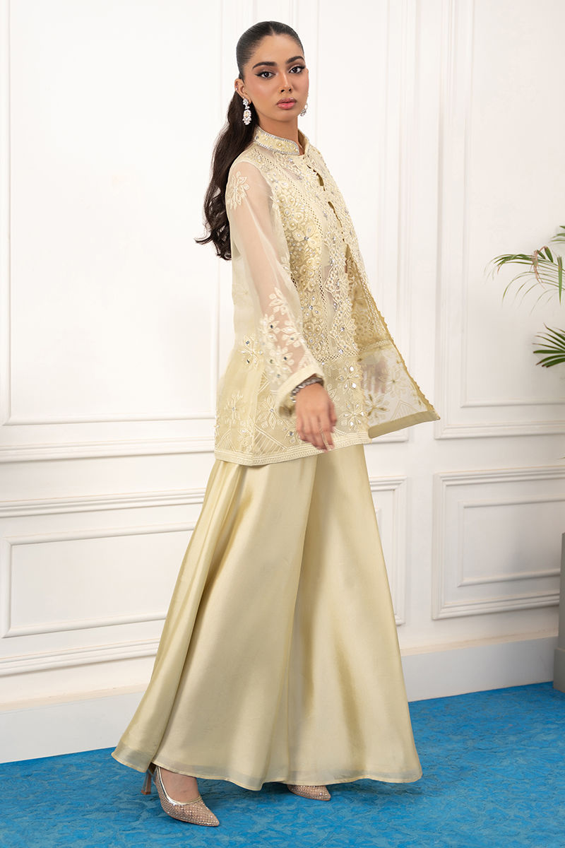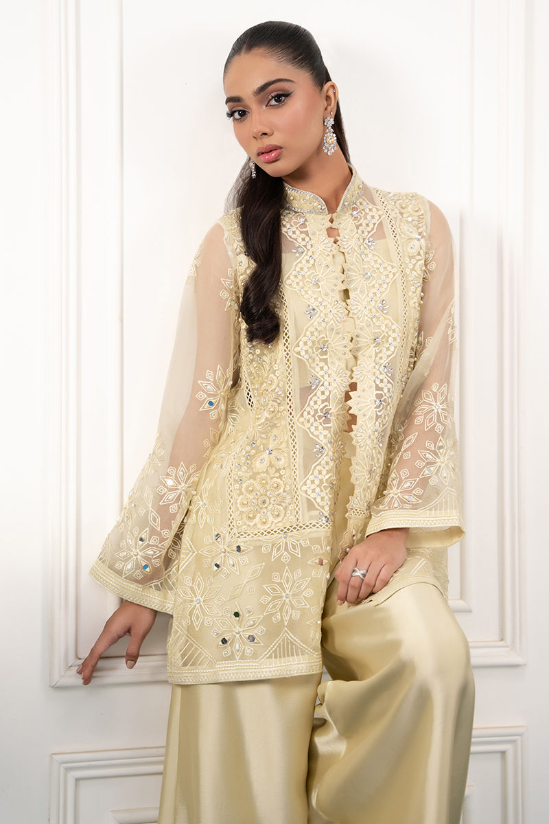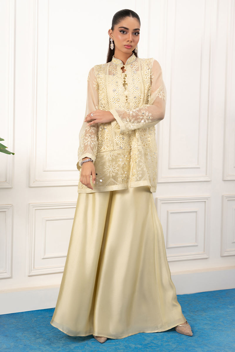 A radiant yellow organza jacket in a front-open, cutwork design, intricately detailed with exquisite hand embroidery featuring pearls, Swarovski crystals, and delicate stones. The sheer elegance is layered over a sleek slip, while a traditional dhaka completes the look, adding graceful volume and timeless charm.