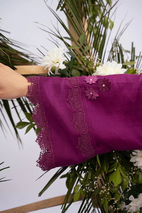 Love for this colour!! Pure raw silk berry magenta shirt is an amalgamation of appliqué on chaak daaman and neckline with stones detail. Finished off with laces on sleeves making it a contemporary statement ensemble. Pants are on pure raw silk. Tissue silk dupatta is finished off with laces putting the whole look together.