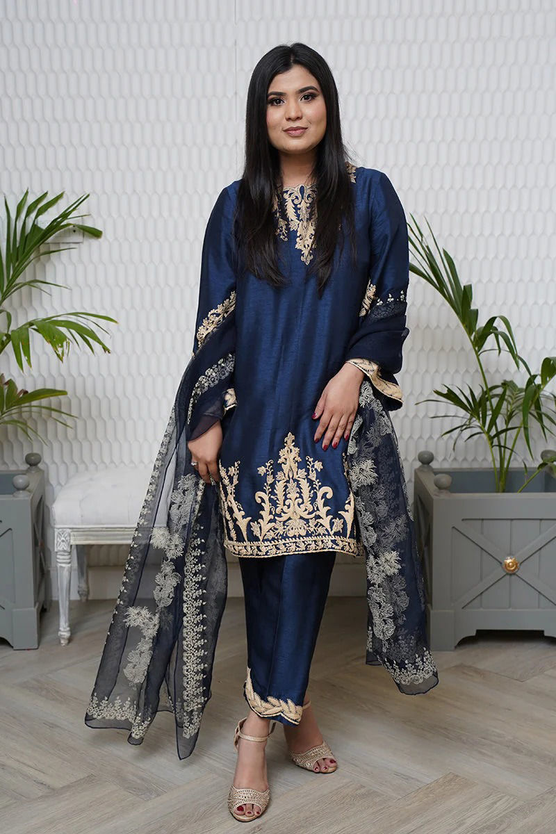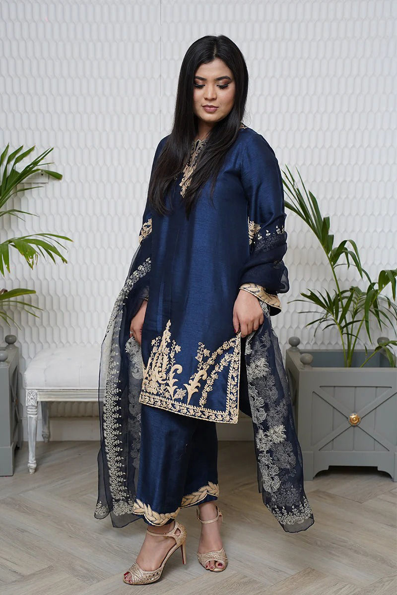 The silk midnight blue shirt is a masterpiece, adorned with artistic and loaded anchor embroidery, showcasing true craftsmanship in every stitch. The embroidery is grand and detailed, creating a vibe. Complementing this exquisite shirt is a block-printed organza dupatta, featuring intricate patterns that add a touch of elegance to the ensemble. The silk anchor-finished pants complete the look, ensuring a cohesive and sophisticated outfit.