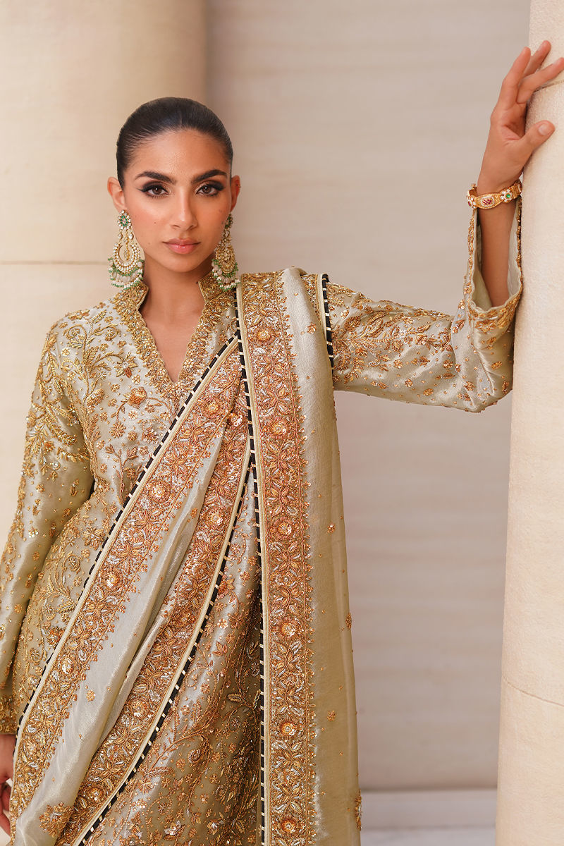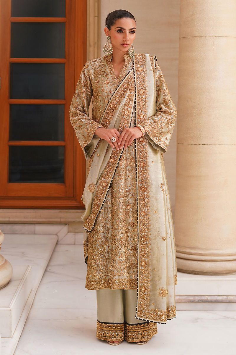 An elegant statement piece, this sage green tissue shirt is styled in a straight long cut, fully adorned with intricate hand embroidery in antique gold and silver tones featuring dabka, kora, and sitara for a timeless shimmer. It is paired with hand-worked izaar pants, finished with appliqued borders and a subtle hint of black, adding depth and sophistication. Completing the ensemble, the dupatta is detailed with hand-worked borders and sleek black piping, lending a regal touch to the overall look. Shirt: Tissue Dupatta: Tissue Izaar: Pure Raw Silk