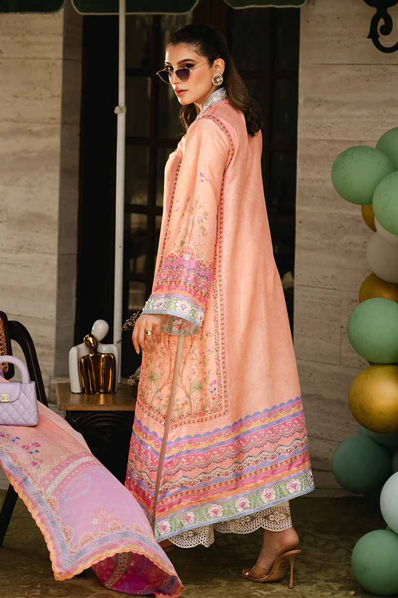 Embrace refined elegance with this in-house designed outfit, featuring a peachy pink pure raw silk garment adorned with a composed textile print that highlights vibrant pops of purple and green. The delicate peachy pink base serves as a graceful canvas for the lively accents, creating a visually striking yet harmonious design. The garment is elevated by intricately embroidered borders along the neckline, sleeves, and hem, adding a touch of artisanal craftsmanship and sophistication. These borders are enhanced with popping piping that provide a bold contrast and further accentuate the outfit’s elegant details. To complete the ensemble, a silk dhaka with an embroidered border adds an extra dimension of texture and visual interest, tying together the outfit with its intricate detailing and luxurious fabric.