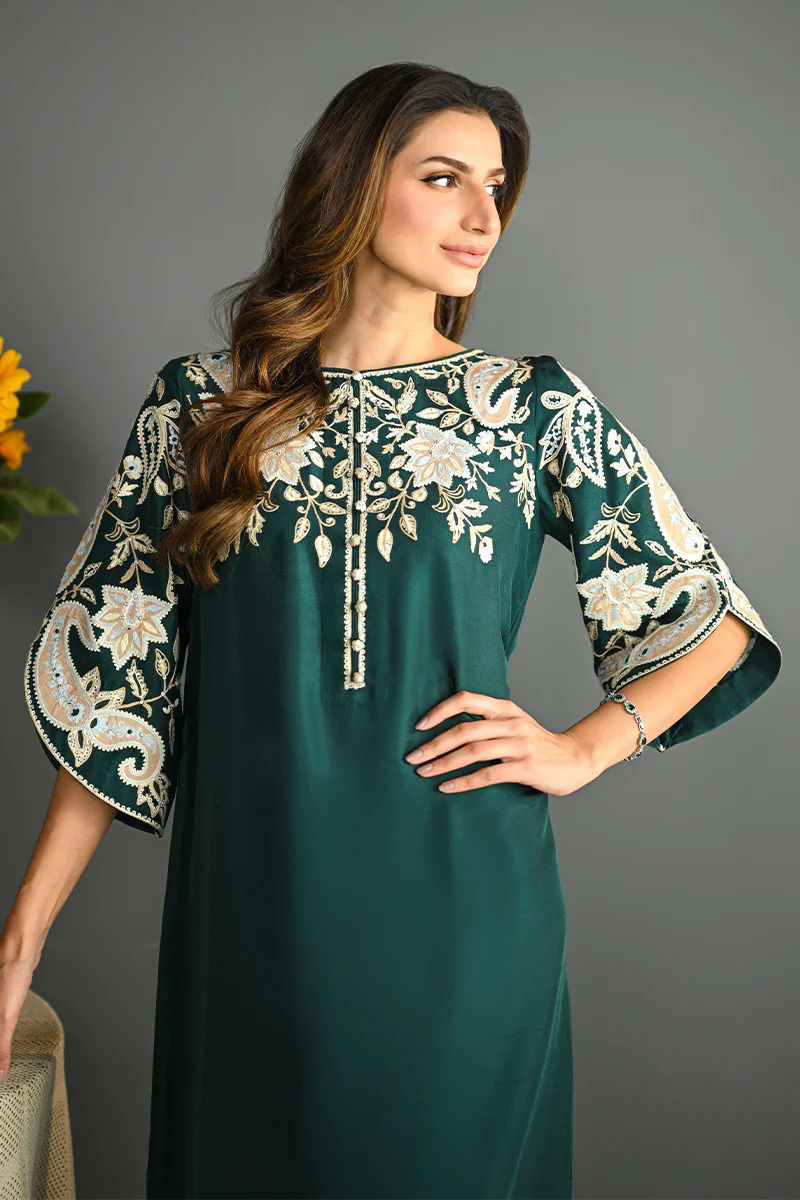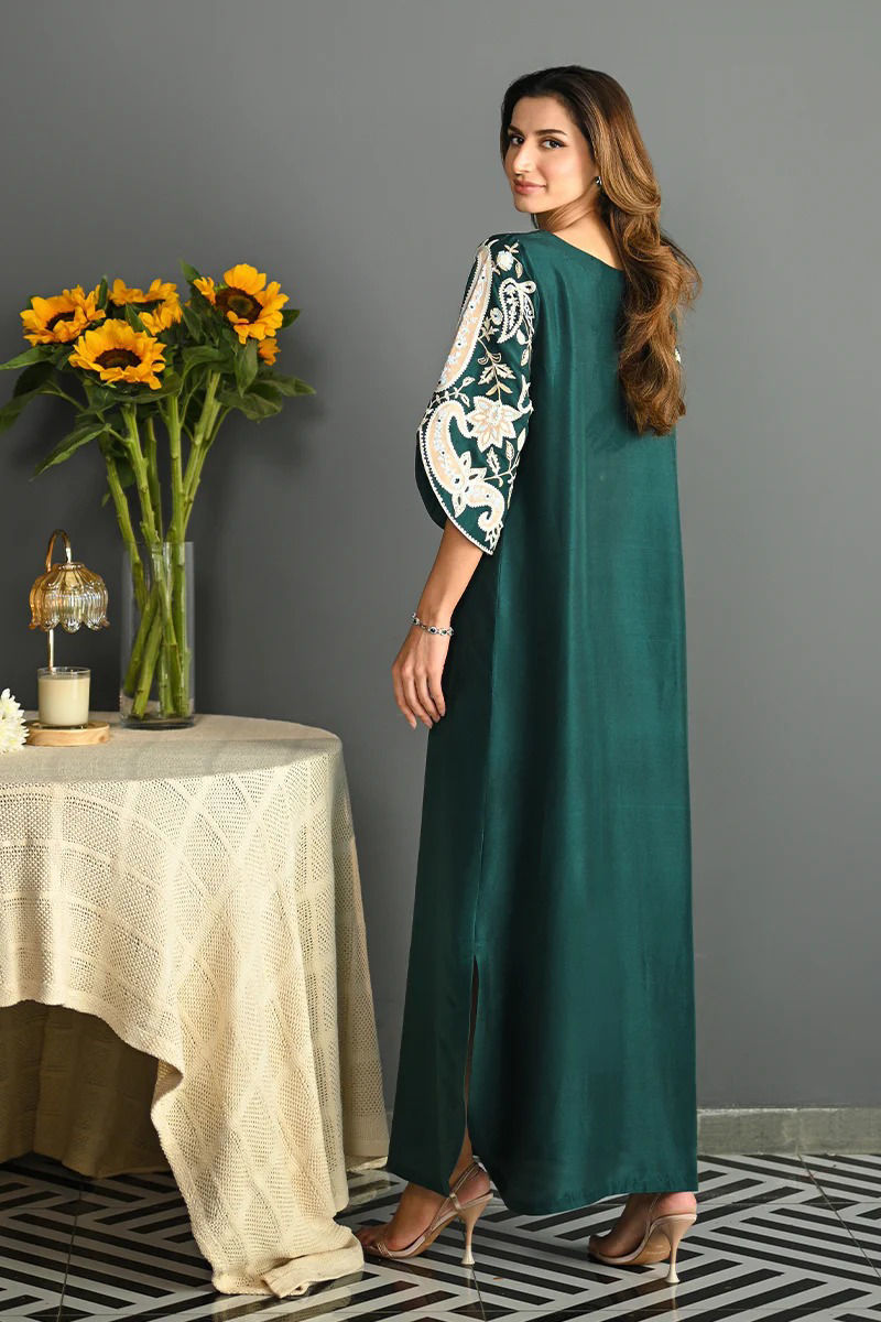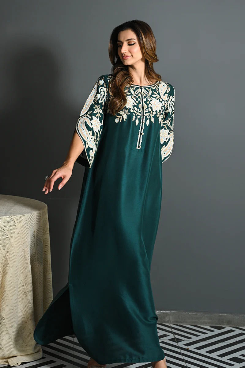 This emerald green kaftan shirt in pure rawsilk radiates elegance and sophistication. The shirt is adorned with intricate aari embroidery around the shoulders and neckline, featuring delicate floral patterns that add a touch of artistry and refinement. The slit open sleeves are elegantly detailed with matching aari embroidery, enhancing the overall design with an added sense of movement and grace. This kaftan is a perfect blend of contemporary style and traditional craftsmanship, making it an ideal choice for a chic, statement look. Pants are an add on. Shirt Maximum length: 57 Model height: 5'9