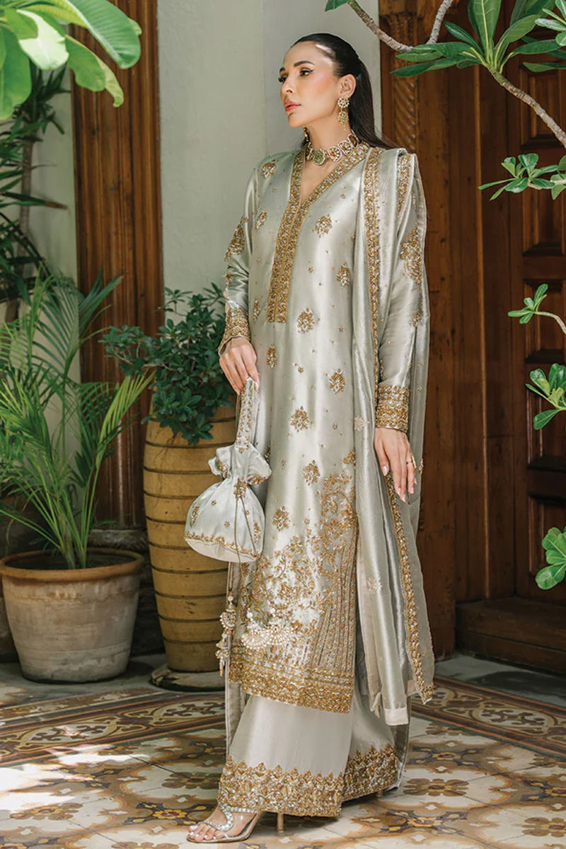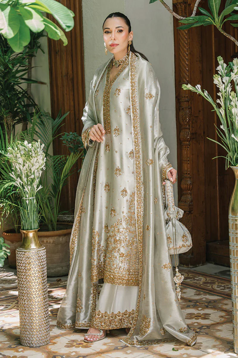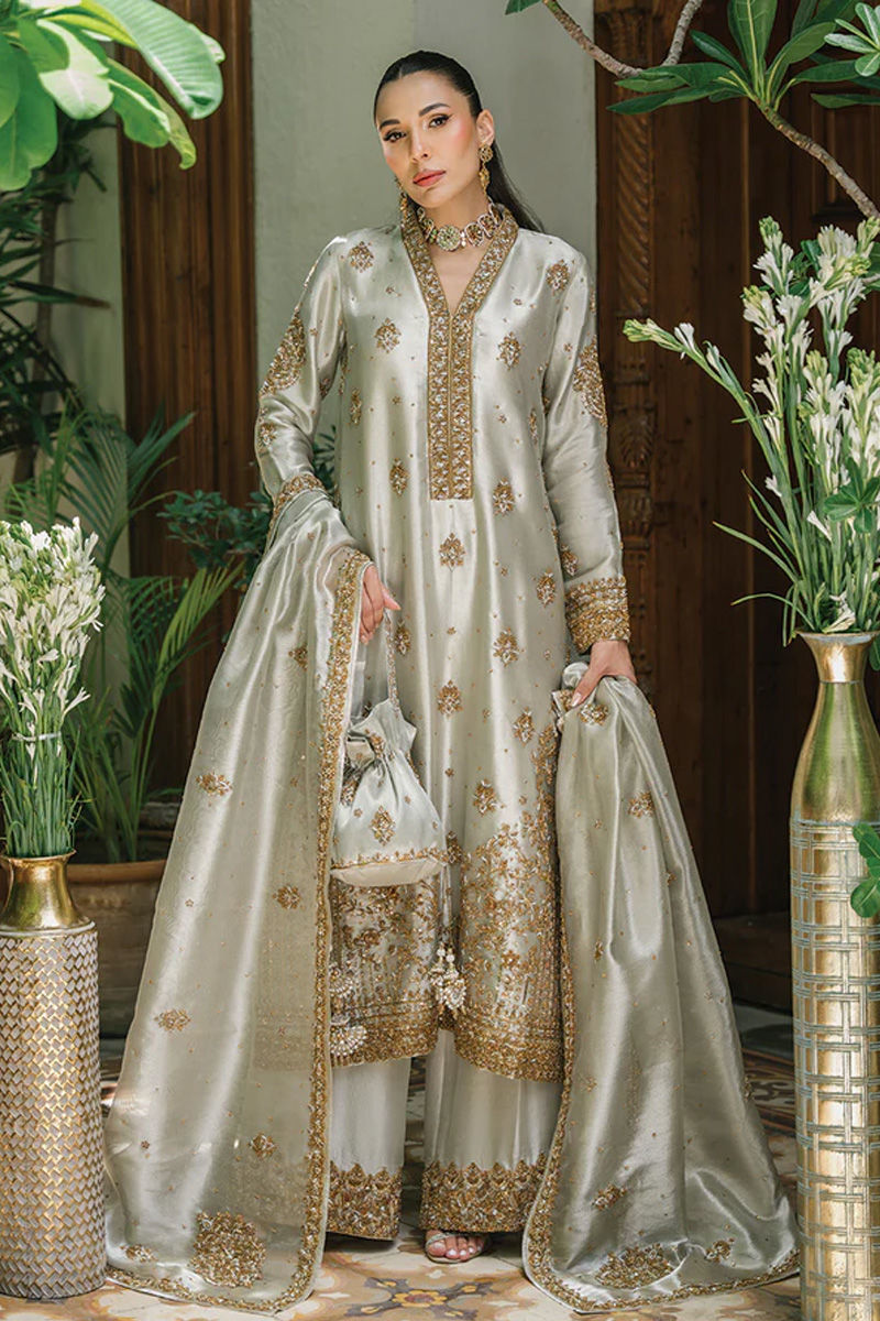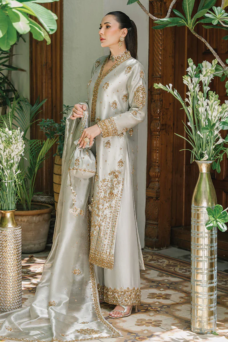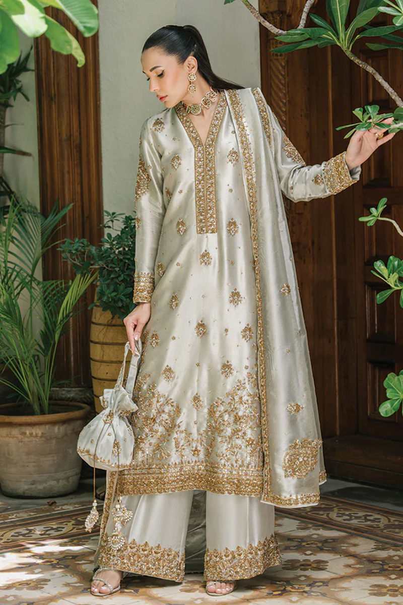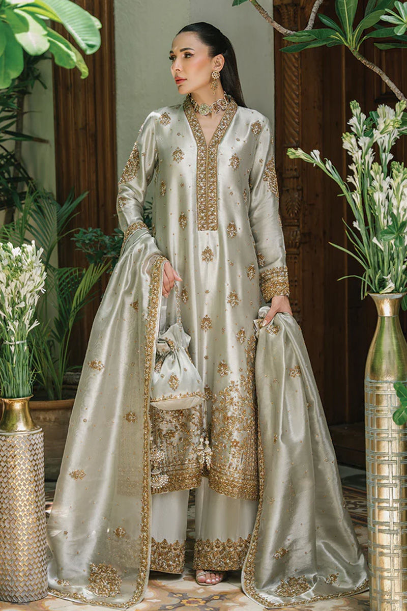 Nurelli: This silver-grey tone formal outfit exudes elegance and sophistication, featuring a shirt and dupatta crafted from luxurious tissue fabric. The shirt is a vision of opulence, meticulously embellished with rich handwork techniques. The detailed embroidery includes an array of dabka, crystals, and sitara, creating a dazzling effect that catches the light with every movement. The izhaar pants are crafted from pure raw silk, providing a luxurious contrast to the tissue fabric of the shirt and dupatta. The pants feature heavy hand-worked borders on the hem, showcasing exquisite embroidery that mirrors the opulence of the shirt. To complete the outfit, a hand-worked potli bag is an add on, designed to reflect the same intricate detailing as the shirt and dupatta. Styling tip: Opt for classic, statement jewelry that complements the rich handwork of the outfit. Style your hair in a sleek, sophisticated updo or soft, polished waves. Shirt: Tissue Dupatta: Tissue Pant: Pure raw silk Izaar: Pure raw silk
