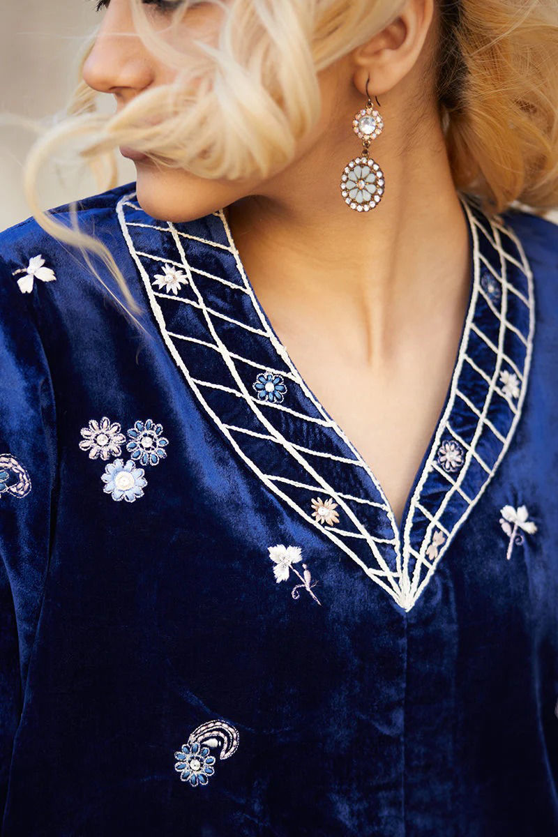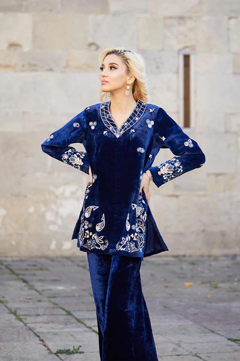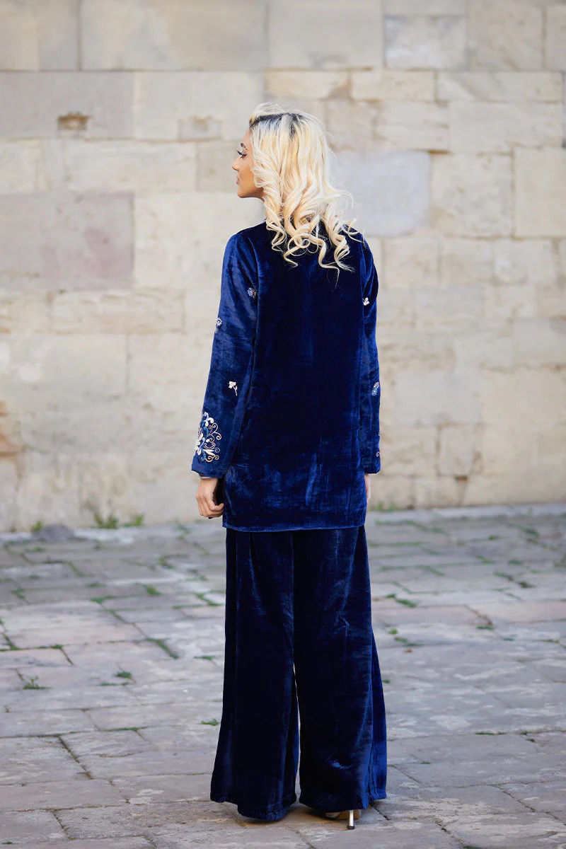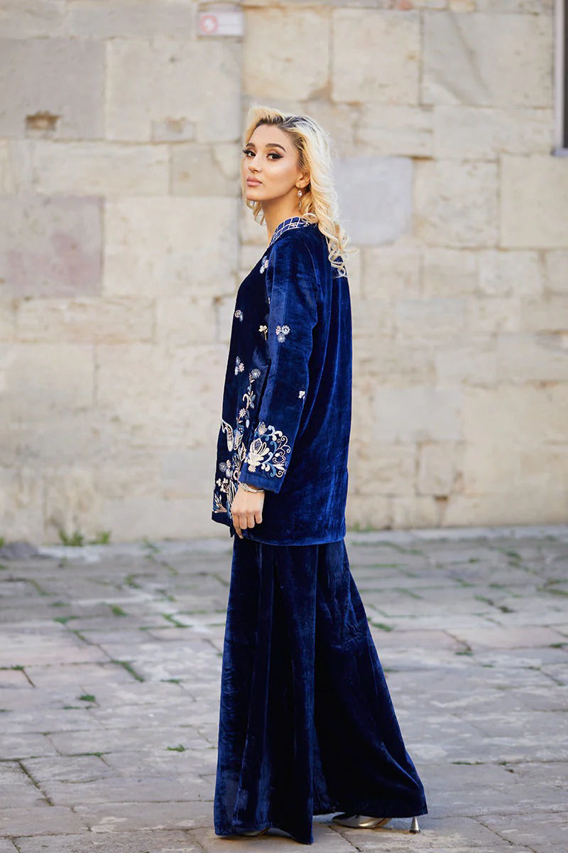 Royal blue jacket and pants is a cut to impress. Meticulous embroidery in colors gives the outfit that pop. Jacket is touched with Swarovski crystals that enhances the understated yet bold look. Dress it up or down for a versatile look and look your best self!