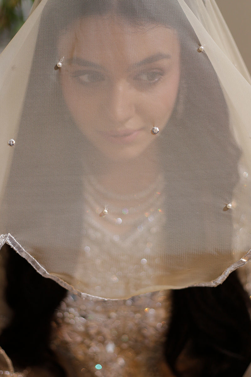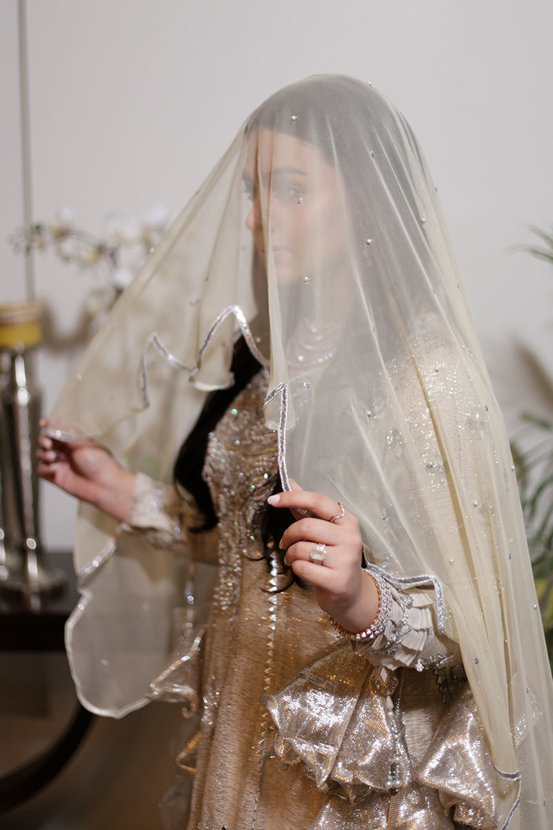 An absolutely dreamy shimmery Ivory kalidar with loaded with handwork and French knot detailing. The back detailing with chunky handwork tassels gives makes this outfit perfect for a bride or bridesmaid. The dupatta is laden with sequins spray and handwork floral motifs and seafoam exaggerated frills to make it enough to turn heads around. Shirt: Shimmer Dupatta: Shimmer Pant: Shimmer