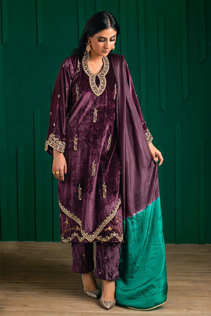 Indulge in the opulence of a plush plum velvet shirt, meticulously adorned with handcrafted zardozi, French knots, and sequins. It is elegantly framed by an appliqué Zari border. Complementing this luxurious ensemble is a stunning ombre silk dupatta, exuding an air of sophistication. The look is completed with pants delicately finished with hand-sewn sequins, ensuring a truly regal appearance.