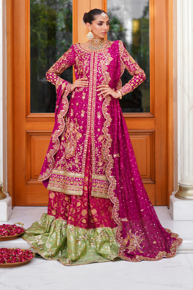 A striking expression of modern regality, this magenta-toned bridal is crafted from pure cotton net shirt and dupatta, lavishly adorned with intricate dabka, sitara, and Swarovski crystals, elevated with pink and green resham accents for a rich play of color. The ensemble is paired with a voluminous jamawar lehenga, where a bold green gharara adds an edgy contrast to the magenta base, creating a dramatic yet harmonious balance. This statement bridal look captures the essence of tradition while embracing a contemporary flair.