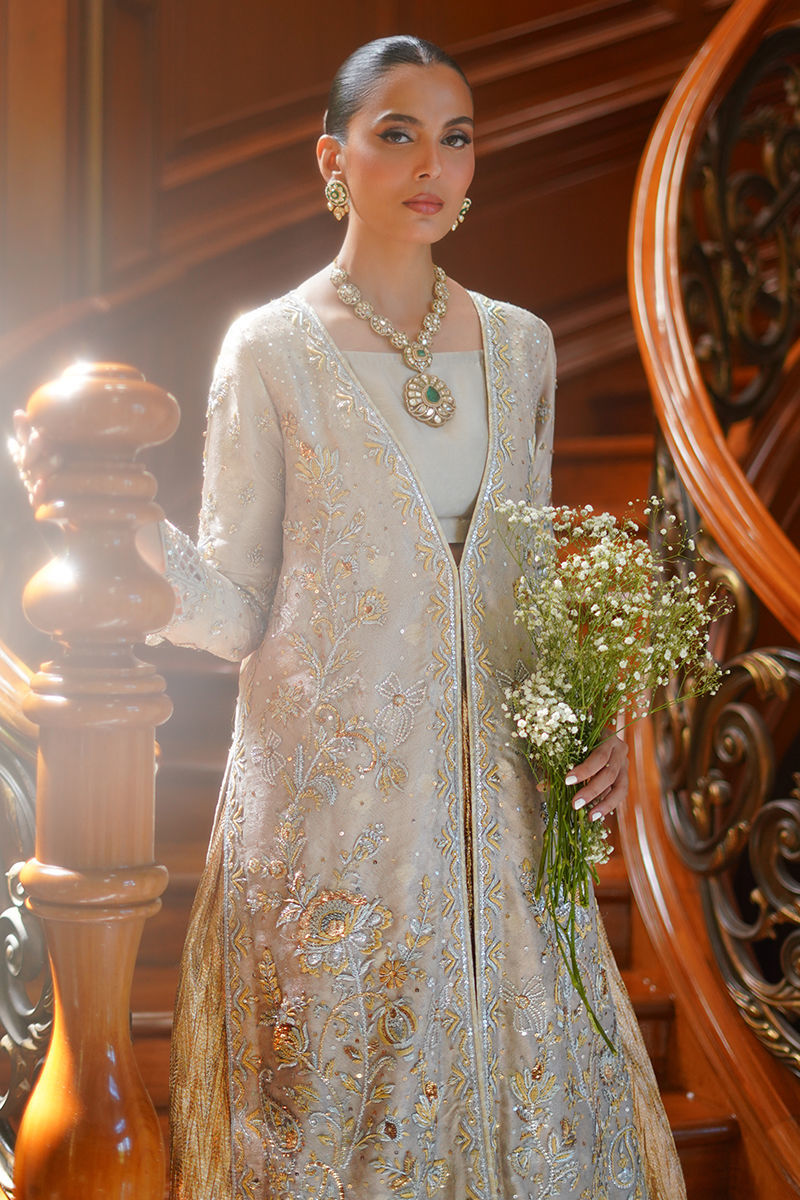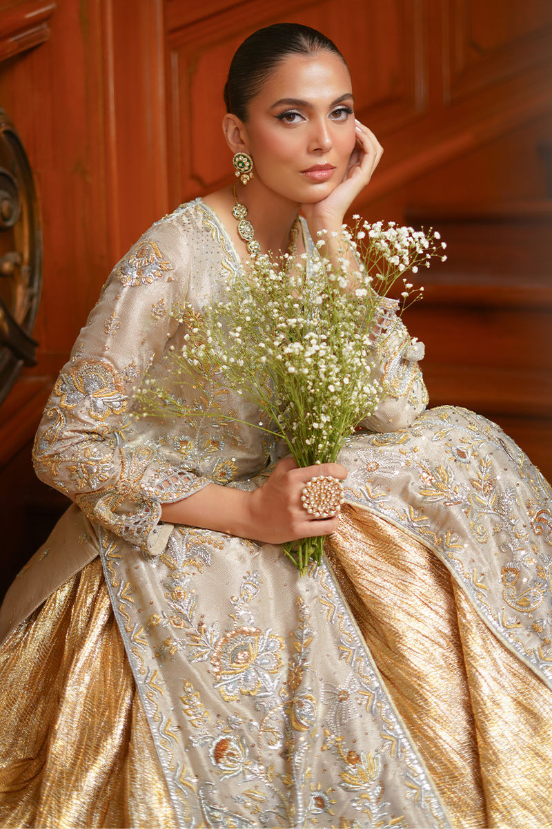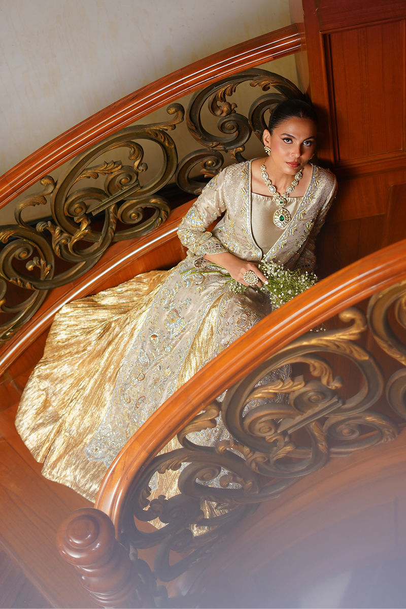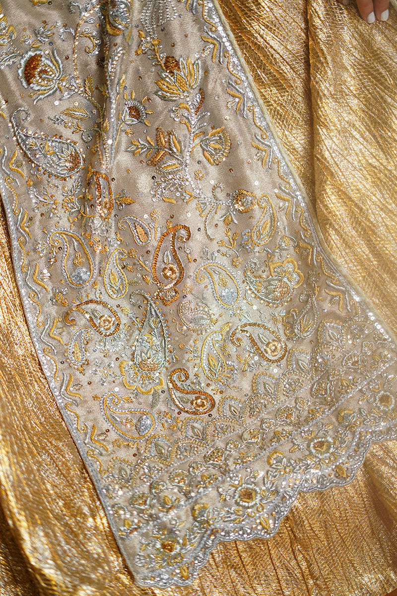 Exuding opulence, this gold self-silk jacket is elevated with striking hand embroidery in antique gold and silver, a dazzling play of traditional craftsmanship and modern finesse. Intricate cutwork details and whimsical 3D bows add dimension and charm to the design. Paired with a self-silk gold crushed lehenga, the ensemble flows with regal grace, making it a statement piece that embodies both grandeur and contemporary elegance. Lehenga: Crushed Banarsi Silk Jacket: Self Silk