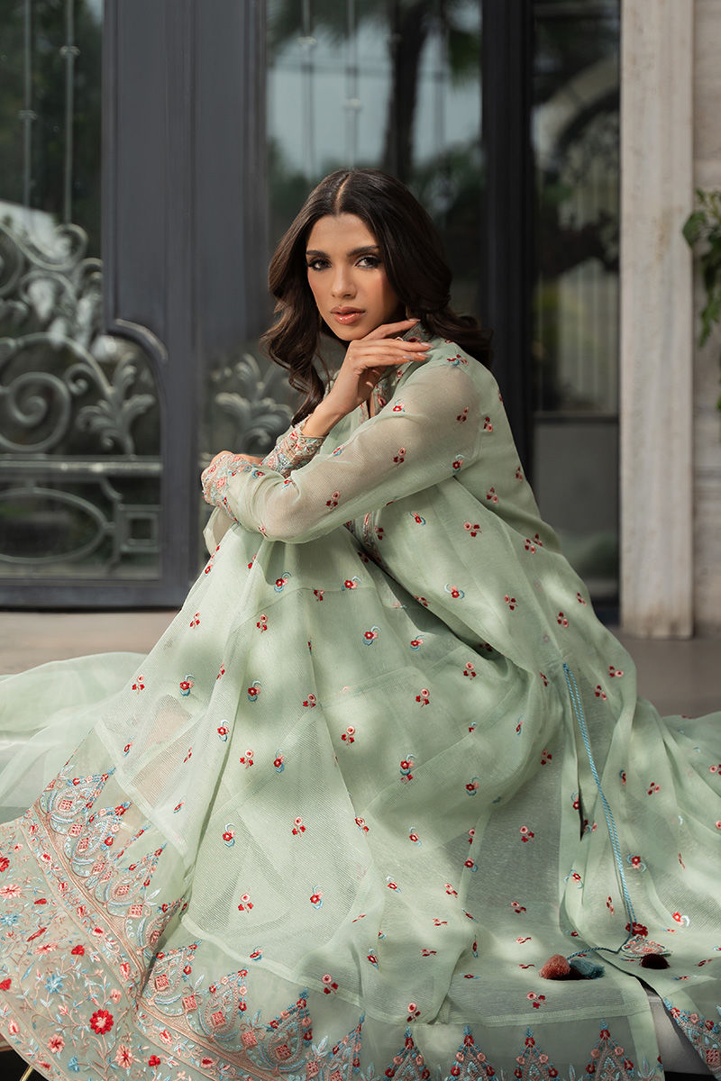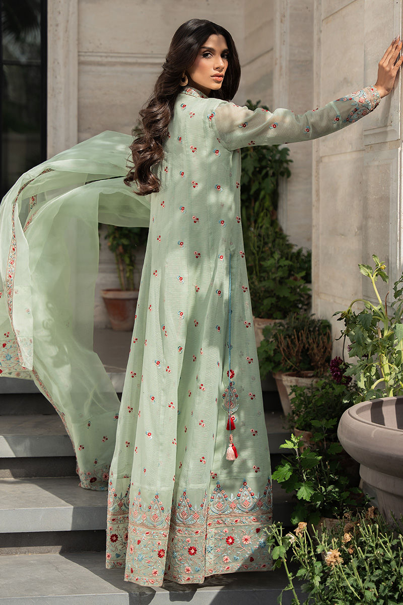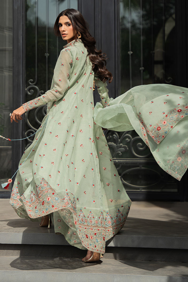 A refreshing pistachio kalidar crafted from airy cotton organza, beautifully embroidered in rich tones of red, blue, and green. The neckline and side slits are finished with handmade buttons and playful tassels, adding a handcrafted charm. Paired with straight pants and an embroidered organza dupatta for an effortlessly graceful look. Style it for Ramzan with soft khussas, dewy makeup, and delicate jhumkis for serene iftar evenings.Model is wearing 58" length