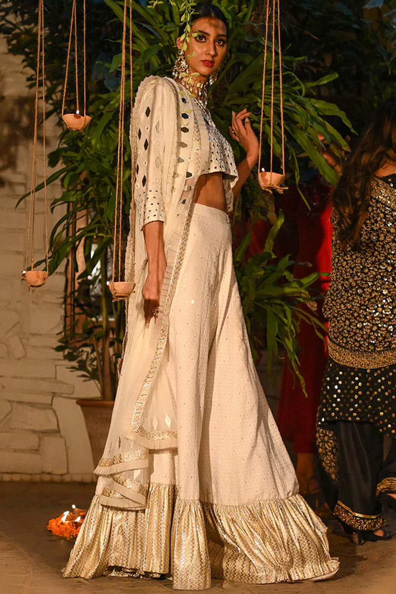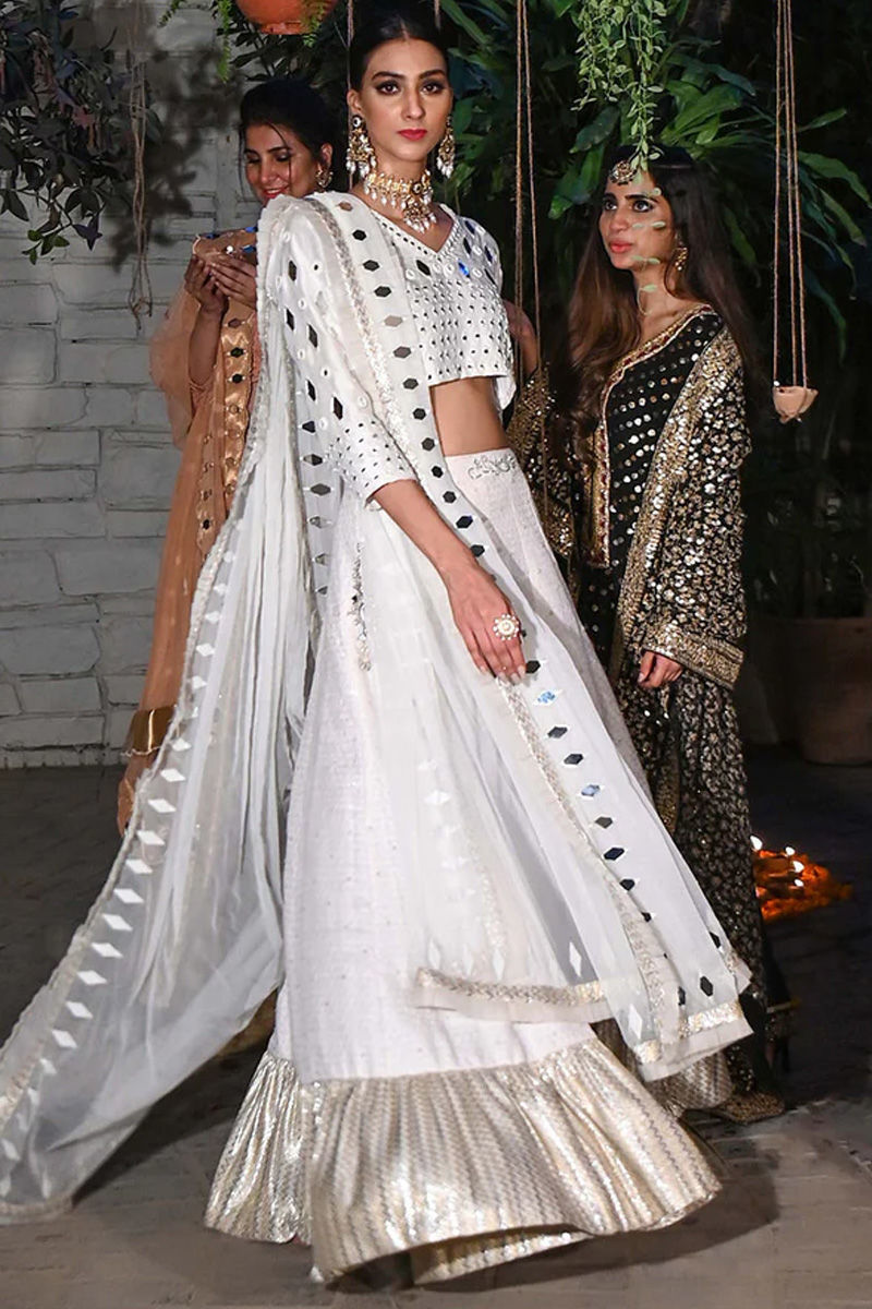 Our rania lengha in perfect hues of White is meticulously crafted with sheesha is paired with raw silk choli with detailed back along with jamawar lengha and net dupatta with mirror and lace finishing.