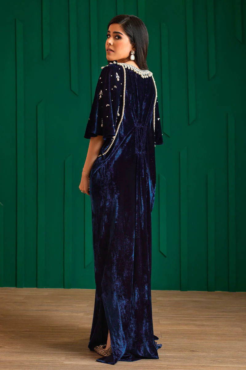 A beautifully cut kaftan with cape style sleeves. Fully handworked stone and pearl details and the pearl hangings gives a vibe. From wearing it to qawwali, Nikkah ,dinners, or literally any festivities, this stunner is a fusion dream