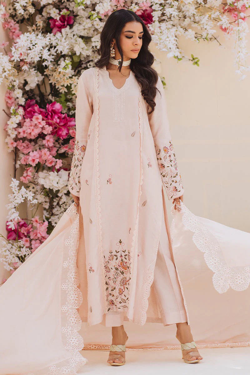 Iftars, Eid, and Milads just got sorted. A mellow pink imported silk shirt with stitch details on the neckline, beautiful embroidery on sleeves, and daman with Swarovski crystal details. Our in-house embroidered scallop and cutwork is appliquéd on chaak (side slits) and the shirt is finished off with scallop laces on the panel. The dupatta is on medium silk with our in-house cutwork scallop embroidery on four sides. You can pair it up with the imported plain silk pants to define the whole look.Shirt: SilkPant: Silk