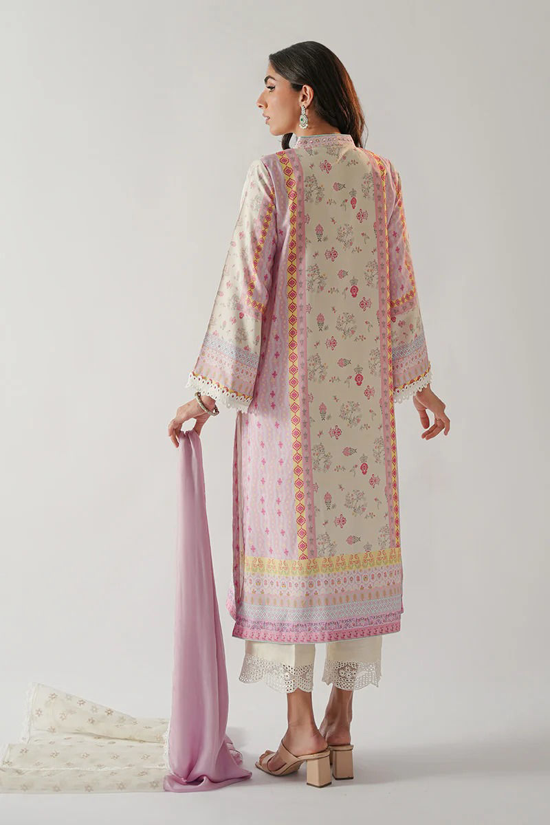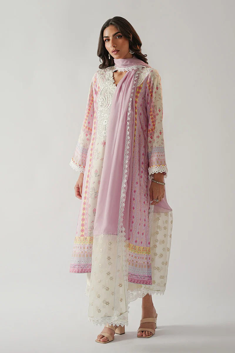 This elegant ensemble features a pink and ivory Khaddi Silk kurta, beautifully printed with intricate patterns that exude timeless charm. The soft pastel pink hue, complemented by delicate ivory accents, creates a refined, graceful appearance. The kurta is enhanced with intricate embroidery around the neckline, featuring floral or geometric motifs that add a sophisticated, artisanal touch to the design.Paired with the kurta is a luxurious tissue silk dupatta, which flows delicately with a subtle sheen. The dupatta is finished with embroidered organza pallo (borders) that elevate its elegance, adding a soft, ethereal touch to the outfit. Silk pants are an add on. Model height 5'10. Maximum length of shirt 48".