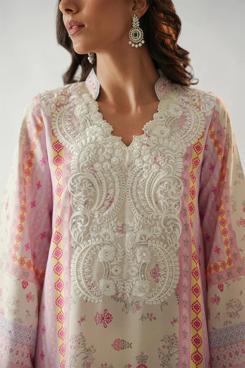 This elegant ensemble features a pink and ivory Khaddi Silk kurta, beautifully printed with intricate patterns that exude timeless charm. The soft pastel pink hue, complemented by delicate ivory accents, creates a refined, graceful appearance. The kurta is enhanced with intricate embroidery around the neckline, featuring floral or geometric motifs that add a sophisticated, artisanal touch to the design.Paired with the kurta is a luxurious tissue silk dupatta, which flows delicately with a subtle sheen. The dupatta is finished with embroidered organza pallo (borders) that elevate its elegance, adding a soft, ethereal touch to the outfit. Silk pants are an add on. Model height 5'10. Maximum length of shirt 48". Shirt: Khaddi Silk Dupatta: Tissue Silk Pant: Pure Rawsilk