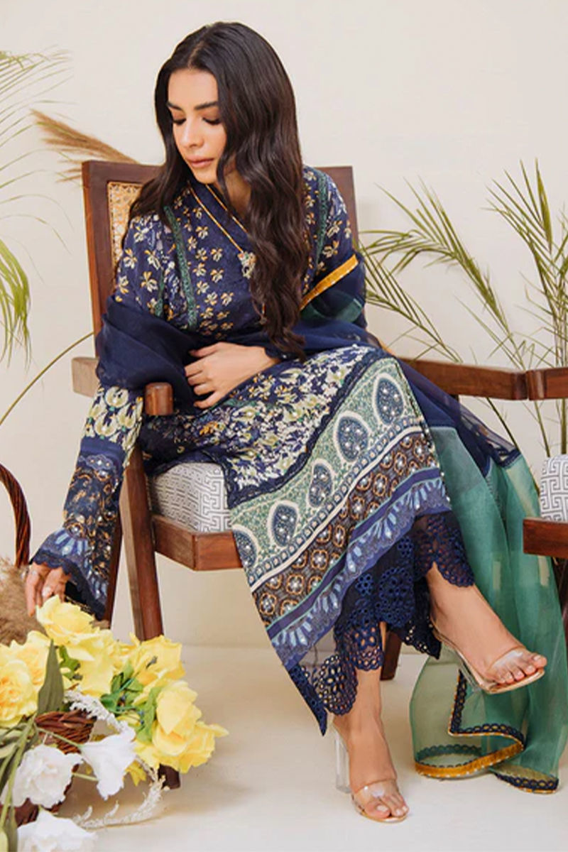 A bold blue in-house printed pure crepe silk shirt is all set to be worn this season with pearl embellishments and fully hand-worked buttons on the neckline. The shirt is finished off with lace detailings and our in-house embroidered cutwork on the daman. Two-toned dupatta is of organza with pretty lace detailing. Pair it with plain silk pants to define the whole look. Shirt: Pure Crepe SilkDupatta: Pure Crepe Silk