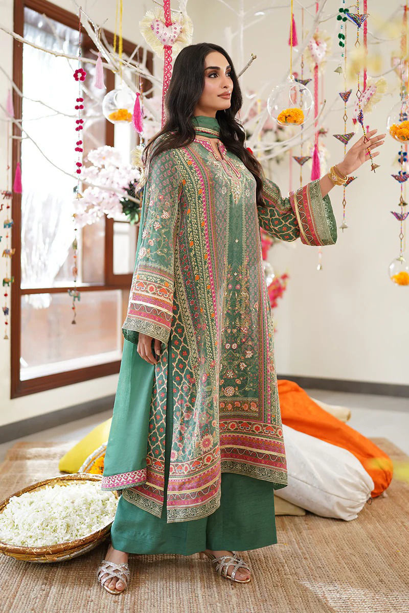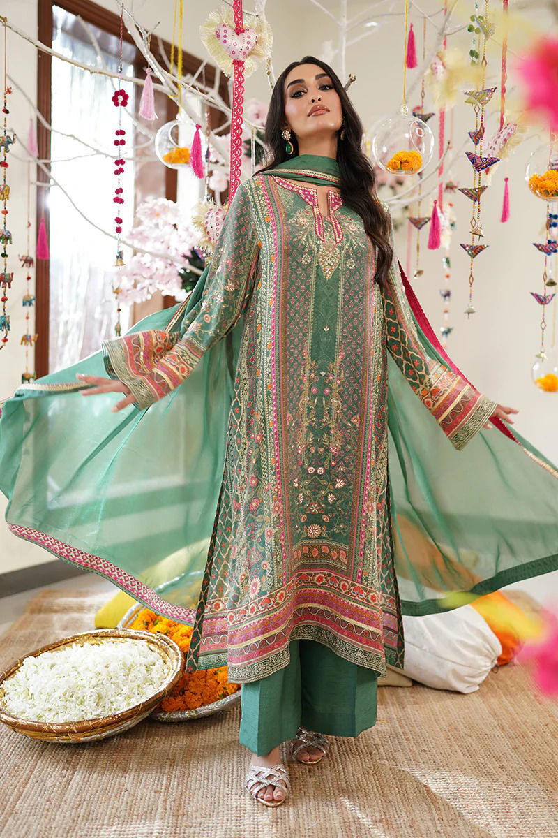 A refreshing green digital print on soft crepe forms the base of this elegant ensemble, elevated with vibrant pops of pink and yellow for a playful yet sophisticated touch. The shirt is further enhanced with delicate hand embellishments that add a subtle shimmer and bring the design to life.Paired with a luxurious tissue silk dupatta, featuring printed borders, contrast piping, and gota finishings, this outfit beautifully balances tradition with modern flair. Coordinated pants are available as an optional add-on to complete the look.Perfect for festive occasions or chic daytime gatherings.Shirt maximum length: 48Model height 5’5