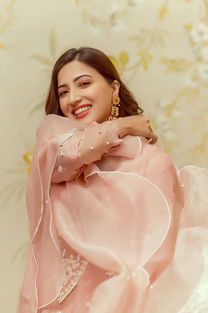 Beautifully embroidered and handcrafted kalidar in cotton net with mirror work and handwork details. It has our signature back. It is paired with a scalloped organza dupatta with hand work spray and lace detailing and statement pants. Perfect for an intimate wedding or any festive occasion.