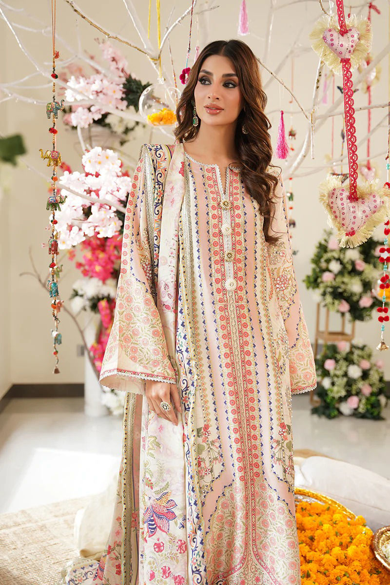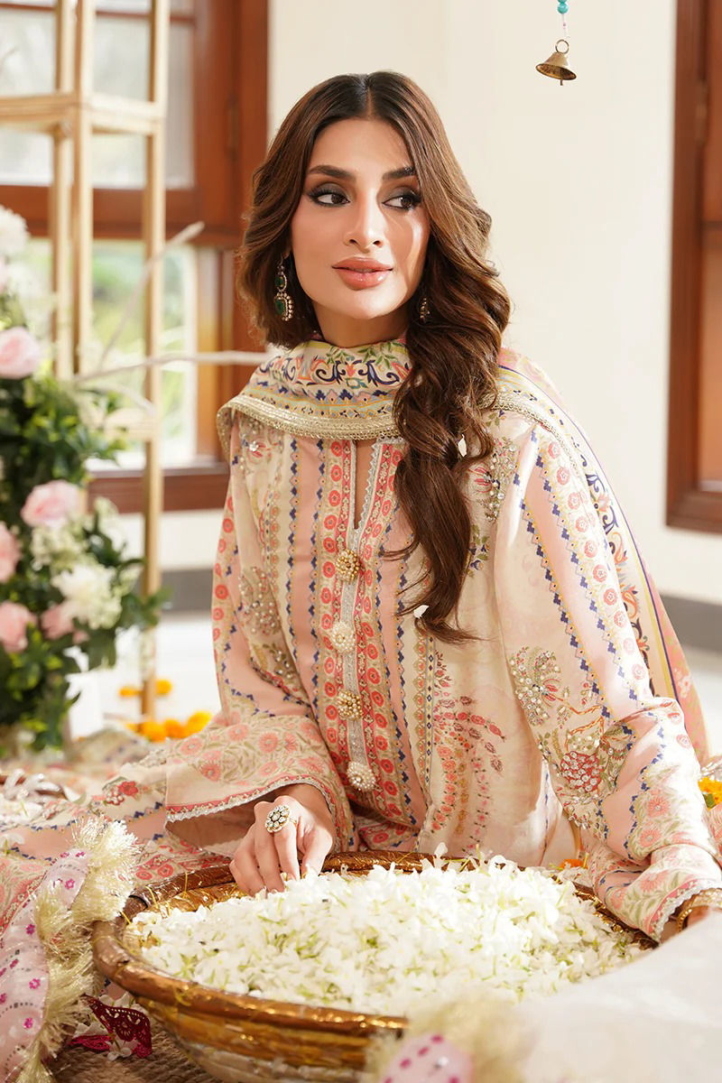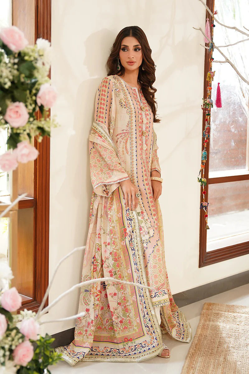 A soft vision in ivory, this pure raw silk ensemble features delicate floral prints in shades of pink, green, and blue — a perfect harmony of color and elegance. The print is tastefully elevated with hand embellishments that add subtle sparkle and depth, bringing the design to life with refined craftsmanship. The neckline is adorned with handmade pearly buttons, adding a touch of timeless charm and enhancing the overall femininity of the outfit. It is paired with a digitally printed crepe silk dupatta, adorned with intricate floral patterns and finished with gota lace for a traditional yet contemporary flair. An ivory pant is available as an optional add-on to complete the look with understated sophistication. Shirt maximum length: 50 Model height 5’8 Shirt: Pure Raw Silk Dupatta: Crepe Silk Pant: Pure Raw Silk