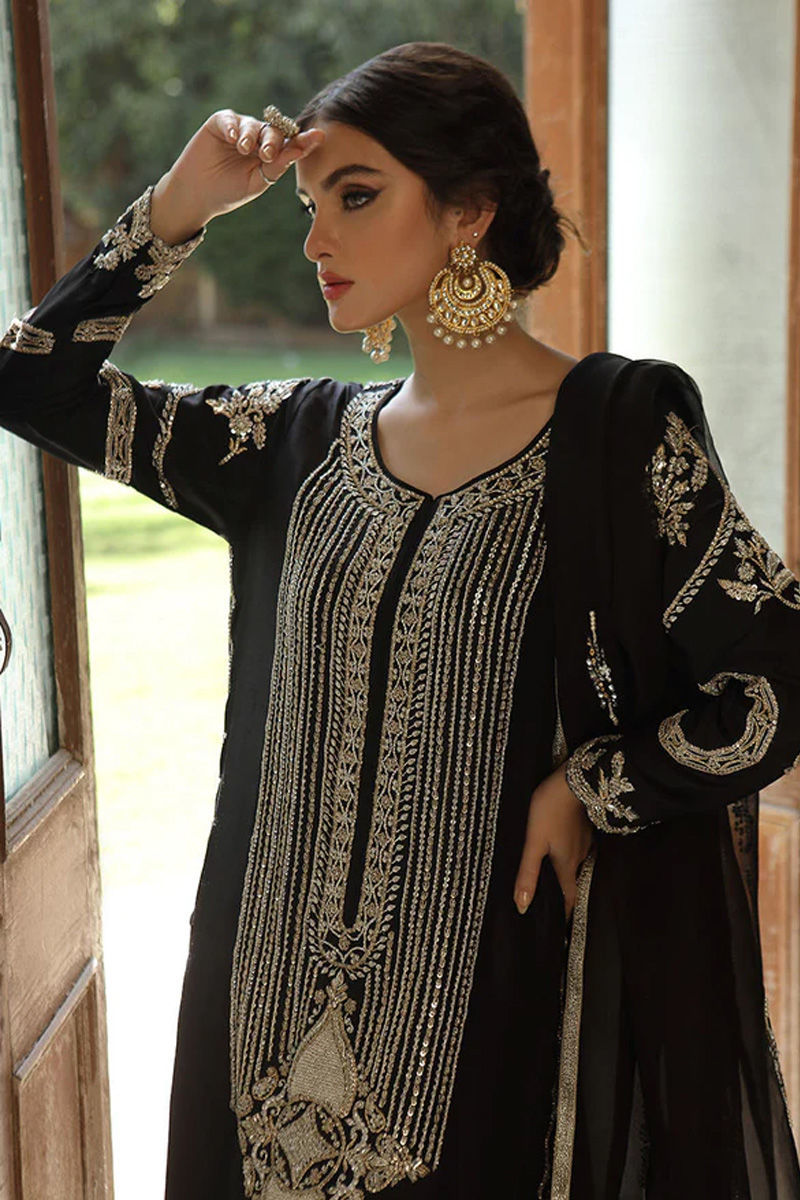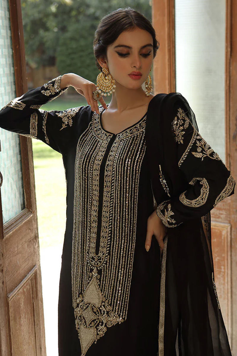 Draped in timeless elegance, this black raw silk long shirt is adorned with exquisite handwork in kora, dabka, and twinkling tikki stone embellishments, casting a luminous charm with every detail. The is further elevated with delicate tassels gracefully accenting the side slits, adding a hint of playful sophistication. Paired with an organza dupatta, beautifully scattered with booti and intricate motifs. Completing the look is a cotton silk block-printed dhaka, grounding the outfit in tradition while infusing it with modern allure—an ensemble that resonates with grace and glamour.