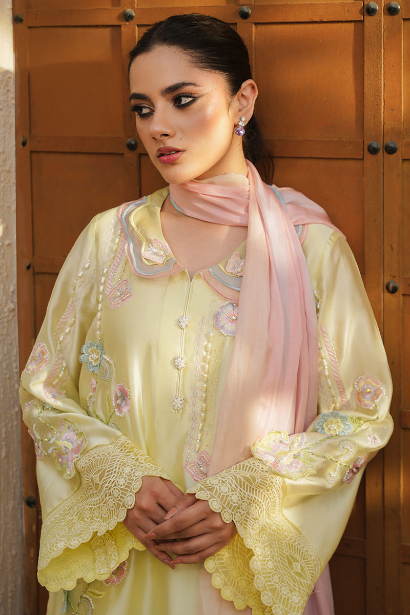 A radiant sheesha silk yellow short shirt and shalwar set, featuring intricate embroidery brought to life with 3D floral and butterfly cutouts. The design is beautifully enhanced with stones, sitara, and pearls, while delicate floral hangings along the shirt hem add playful movement. Paired with a three-tone ombré dupatta in soft pastel shades of yellow, blue, and pink, finished with tassels on all four corners, the ensemble captures a perfect blend of whimsy and elegance.