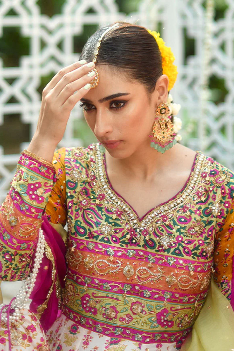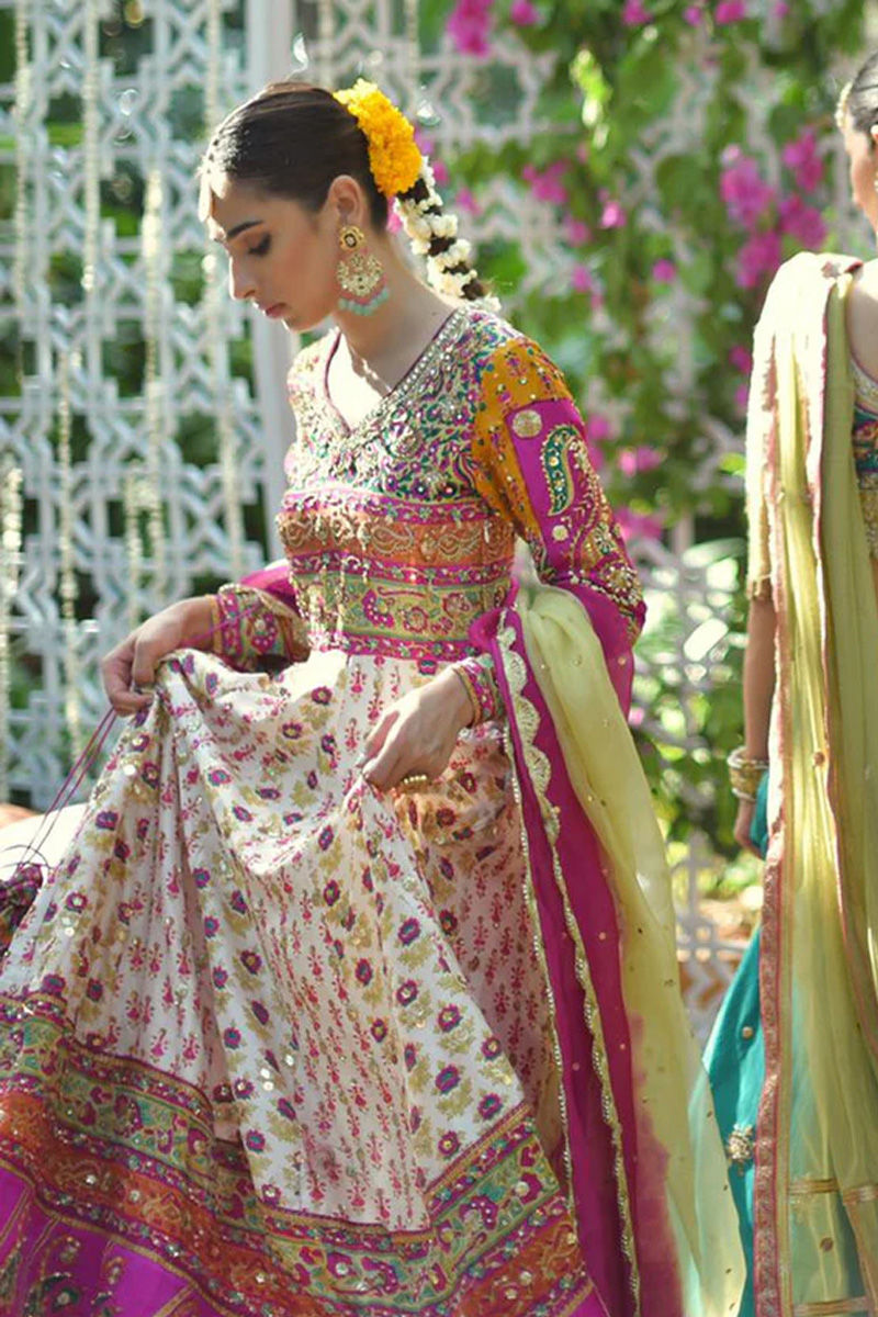 An absolute show stopper! This has to be our Favourite for the season! We share a bias towards it because of the burst of colours! It is a full on Festive Dhamal outfit just perfect for a shendi or mehndi! An absolute show stopper. The lubna kalidar is designed to give a slender waistline an extra flaring kalis for that unforgettable twist and stunning silhouette. Wear it as a modern-day fairy-tale bride that makes you feel like a timeless princess. It is fully hand printed on pure raw silk in tones of pink, orange, mustard, saffron and green. The bodice is fully hand worked with zardozi kora dabka gotta kundan to make you dazzle on your special day. The show stopping back with intricate hand work and cut out details is enough to raise temperatures! Kalidar is fully sprayed with handwork and the pure charmeuse silk borders are also ladened with work and colour! We have paired it up with fuscia pink and kiwi green organza Duppata with gotta details and scallops ladened with chan. You may add a lengha and potli pouch. Shirt: Raw Silk Dupatta: Raw Silk