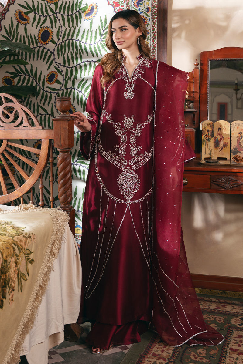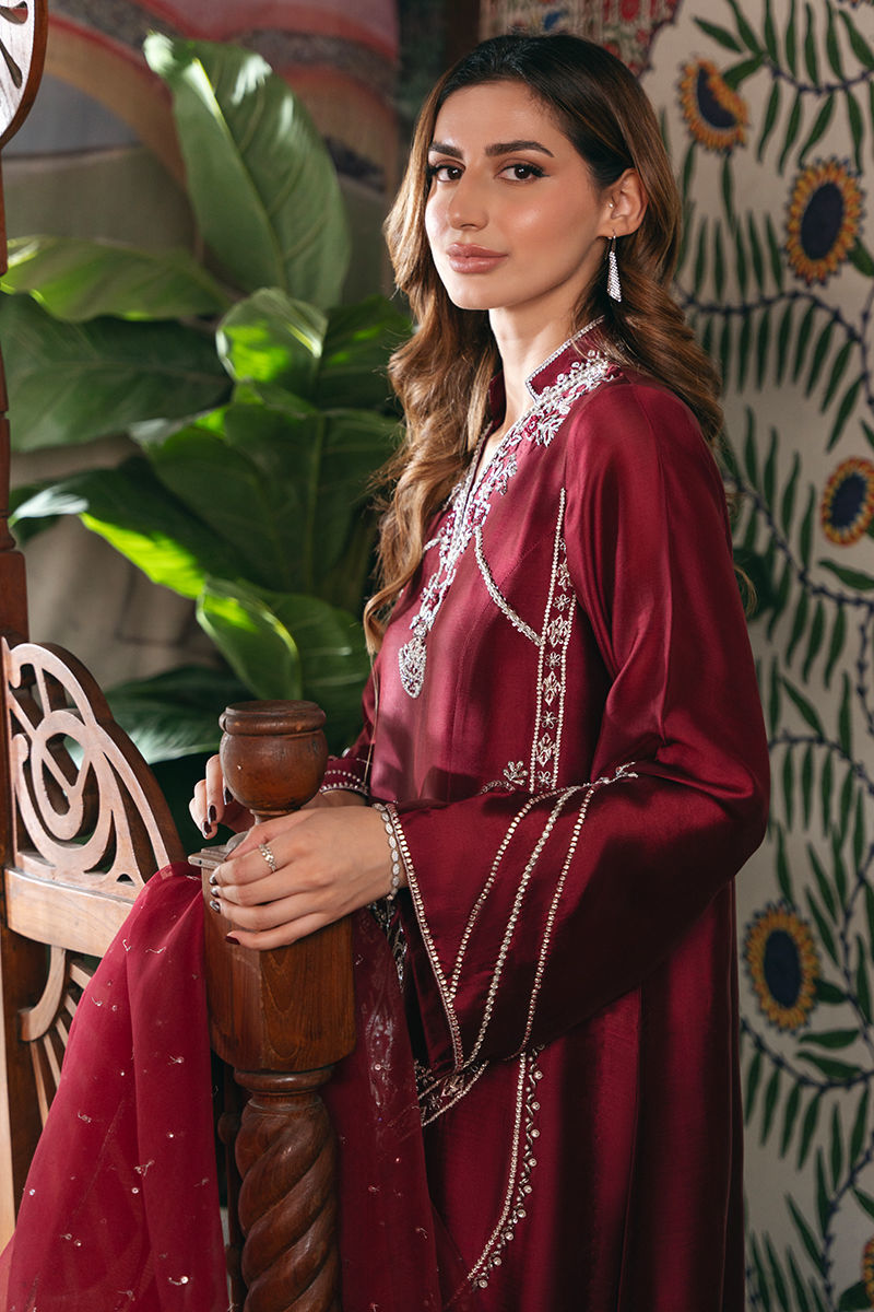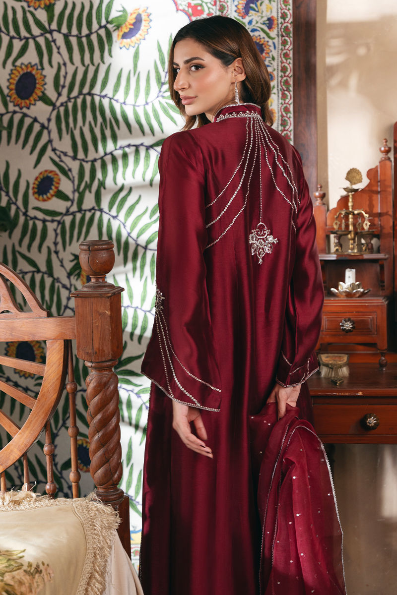 Turn heads this season with our luxurious maroon sheesha silk ensemble, a true testament to timeless elegance. This long shirt is adorned with intricate silver handwork of resham, stones, dabka, and sequins, showcasing handwork that elevates the neckline, sleeves, and back. Completing the look is an embellished organza dupatta, thoughtfully designed to add balance the richness of the outfit. Paired with a classic dhaka, offering a graceful silhouette. Perfect for year-round wear, Style it with statement jewelry and heels for a look that exudes sophistication and celebrates the art of fine design. Shirt: Sheesha Silk Dupatta: Organza