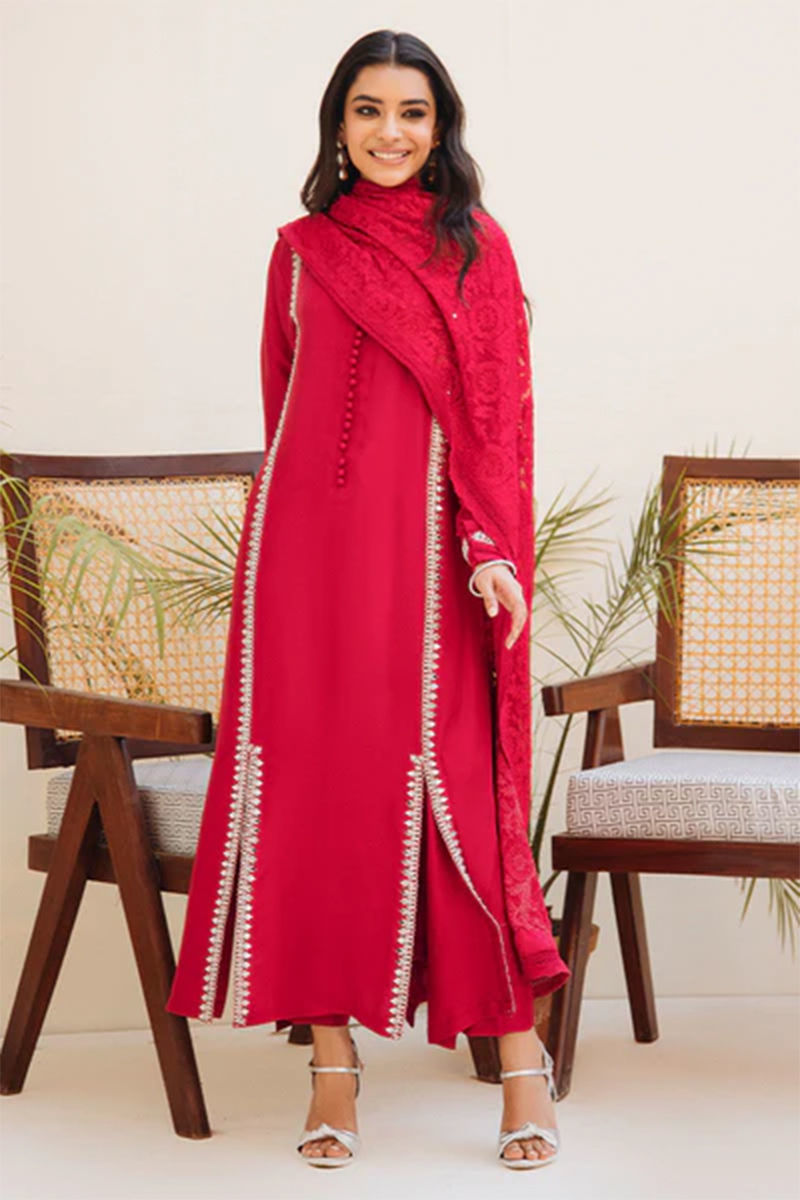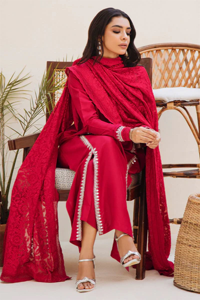Make heads turn with this striking red pure raw silk shirt with hand-worked (mirror, kora dabka, crystals, and French knots) details on the panel, slits, and sleeves with classic French knot buttons on the neckline. We love all embroidered schiffli dupatta creating a monotone look. Paired with pants in plain raw silk.Shirt: Raw SilkPant: Raw Silk