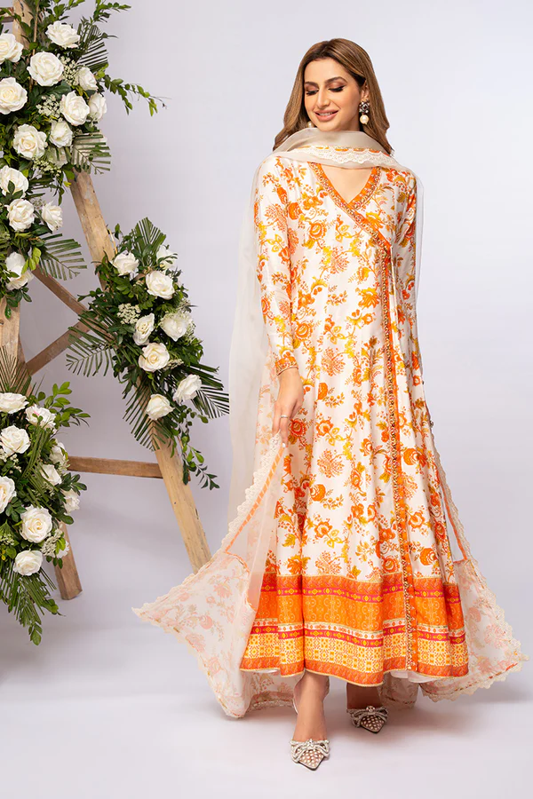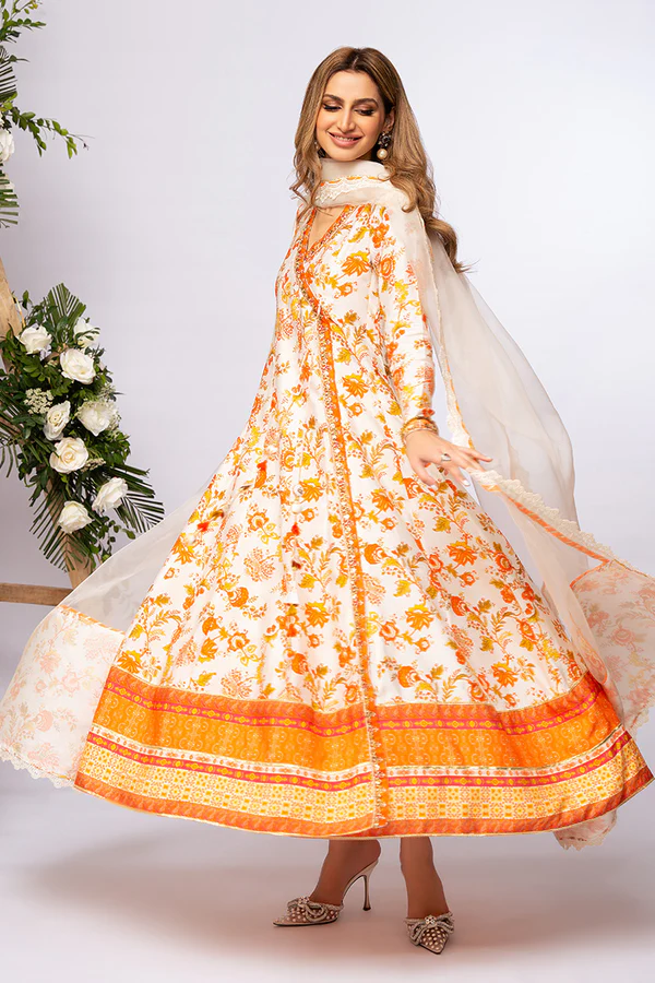 Ivory and burnt orange tones of floral print on a beautifully cut angrakha. Embroidery and hand work defines the cut and sleeves hem. Gota laces on daaman brings out the print am making it a super transitional ensemble. Our signature tassles are a must…..twirl around this festive season and make a bold statement. Dupatta is on organza with printed pallus and finished off with scallop laces. Pants are on silk.