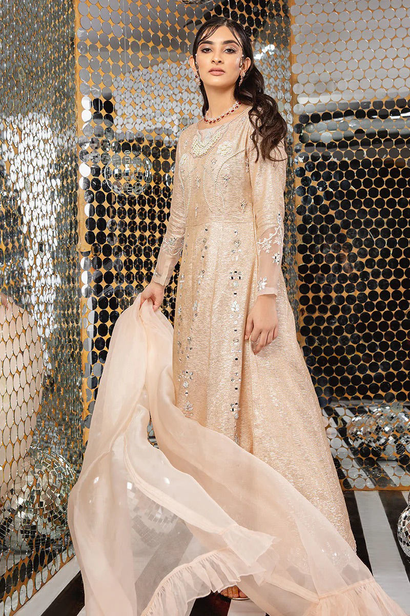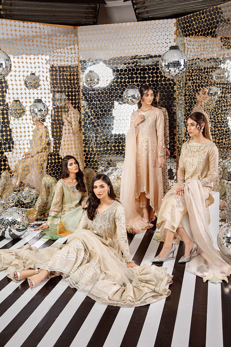 A chic hi-low flattering silhouette in blush pink shimmer fabric. The outfit is encrusted with hand work pearls crystals and gota. The sleeves are detailed with embroidery. Complete the look with our organza ruffled dupatta and signature pants.