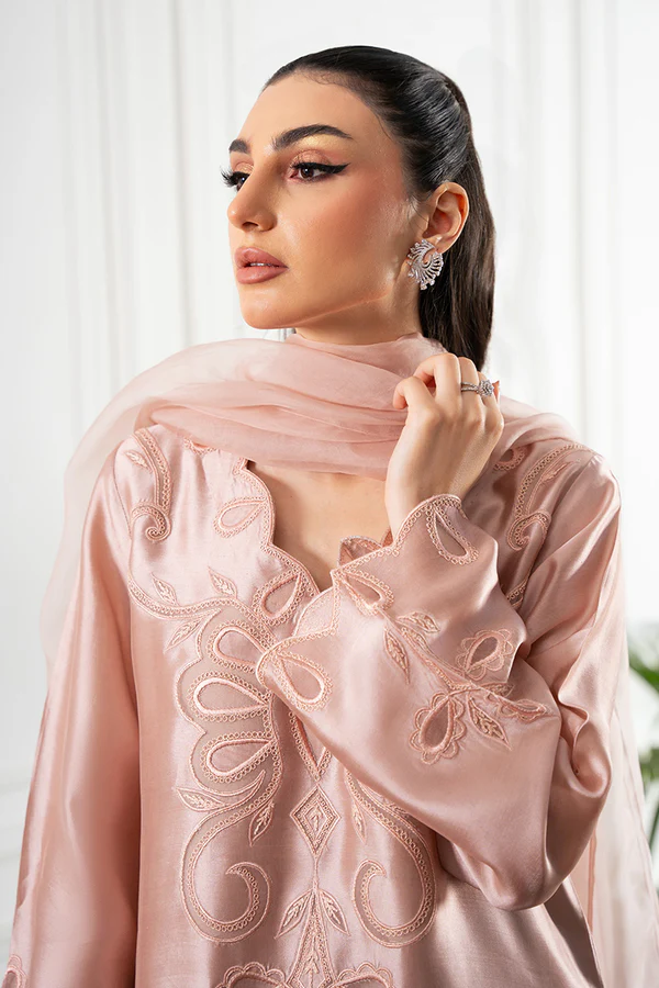 A dusty pink sheesha silk shirt is a true stellar showcasing the art of appliques and cutwork. An umbrella cut Dhaka compliments the otherwise round daaman kurta, giving it that volume. Organza dupatta with pleats and appliqués makes everything come together for the perfect Eid luxe look.