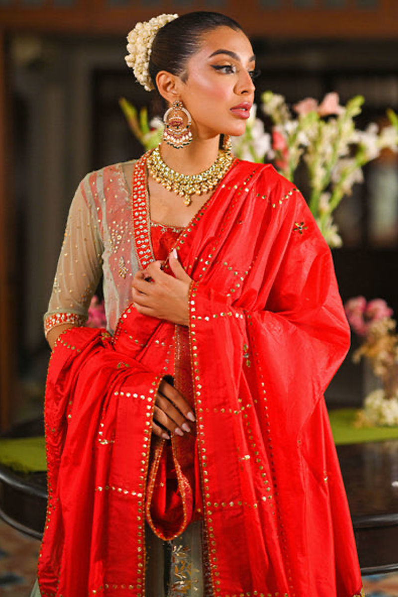 The mint green kalidar angrakha is a sight to behold, adorned with handcrafted age-old kaamdani bunches that exude elegance. Intricate kora, dabka, and resham bootis, sprinkled with sequins, add a touch of opulence. The burnt orange choli creates a striking contrast and leaves a lasting impact. The dramatic back, embellished with appliqués, kamdani, and kora dabka bootis, adds an element of allure. Completing the look is a super stunning two-toned kattan silk dupatta, featuring a heritage pattern of kamdani and Gota bunches. This ensemble is the perfect choice for a mehndi bridal outfit, encapsulating tradition and modernity in one breathtaking ensemble. * Colour can be Customized